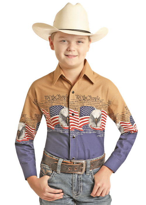 Navy and Tan with Flag and Eagle Border Print Long Sleeve Snap Front Shirt.