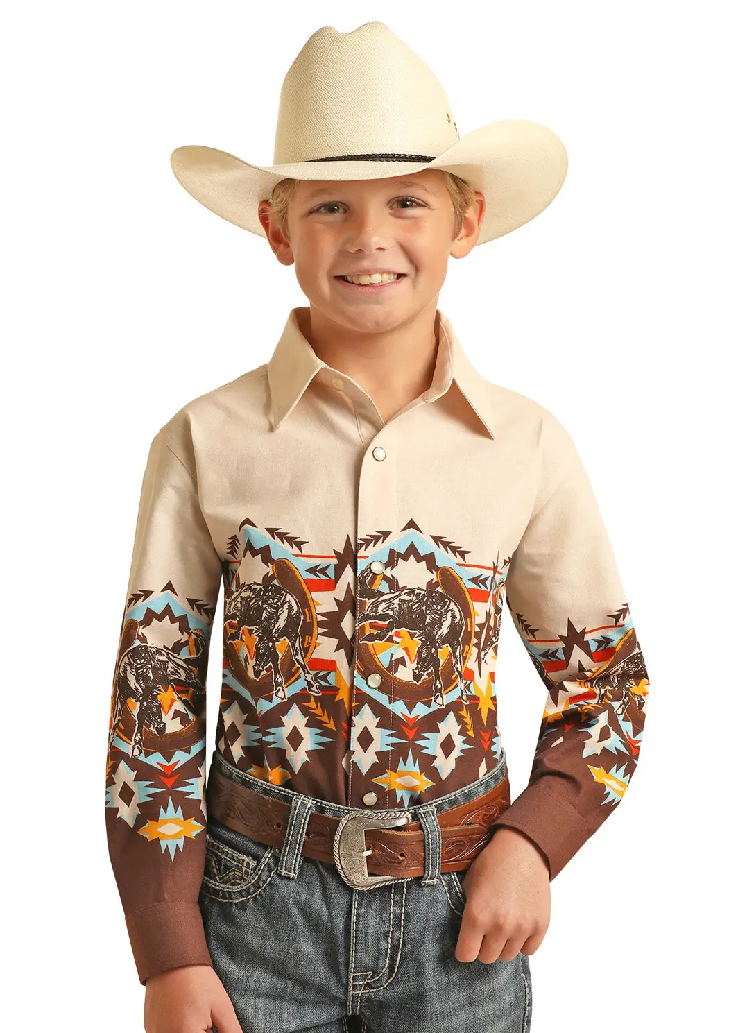 Tan and Brown Long Sleeve Snap Front Shirt with Horseshoe and Bucking Horse Border Print.