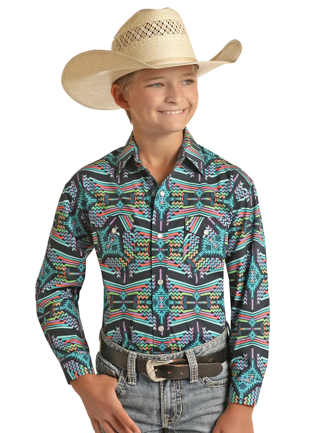 Black and Multi-Color Neon Aztec Print Long Sleeve Snap Front Shirt.