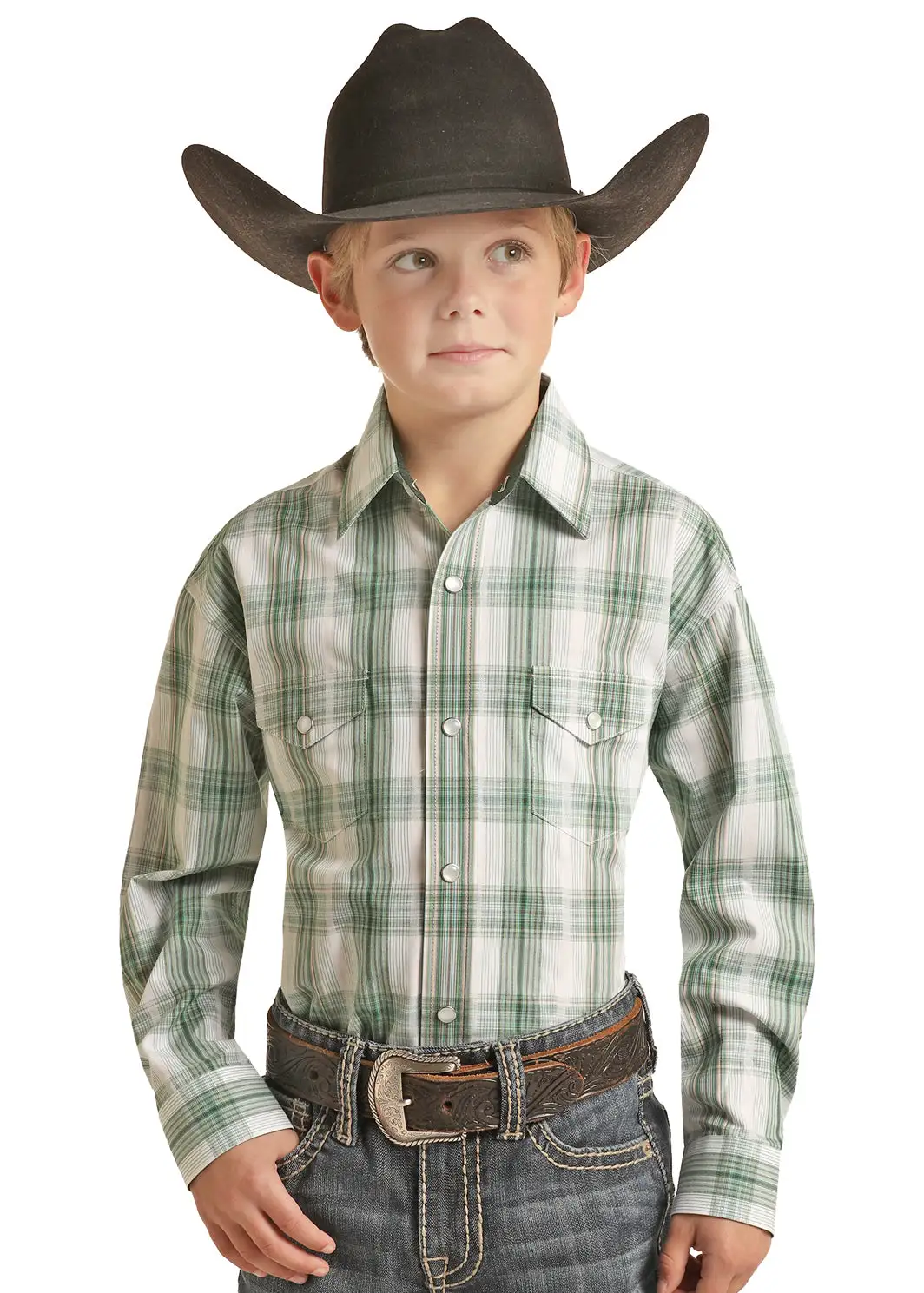 Green and White Plaid Long Sleeve Snap Front Shirt.
