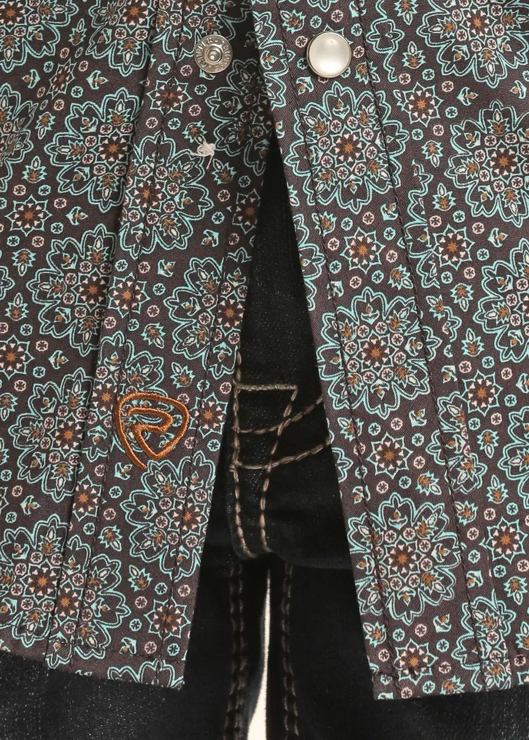 Blue Green Medallion Print Long Sleeve Snap Front Shirt.