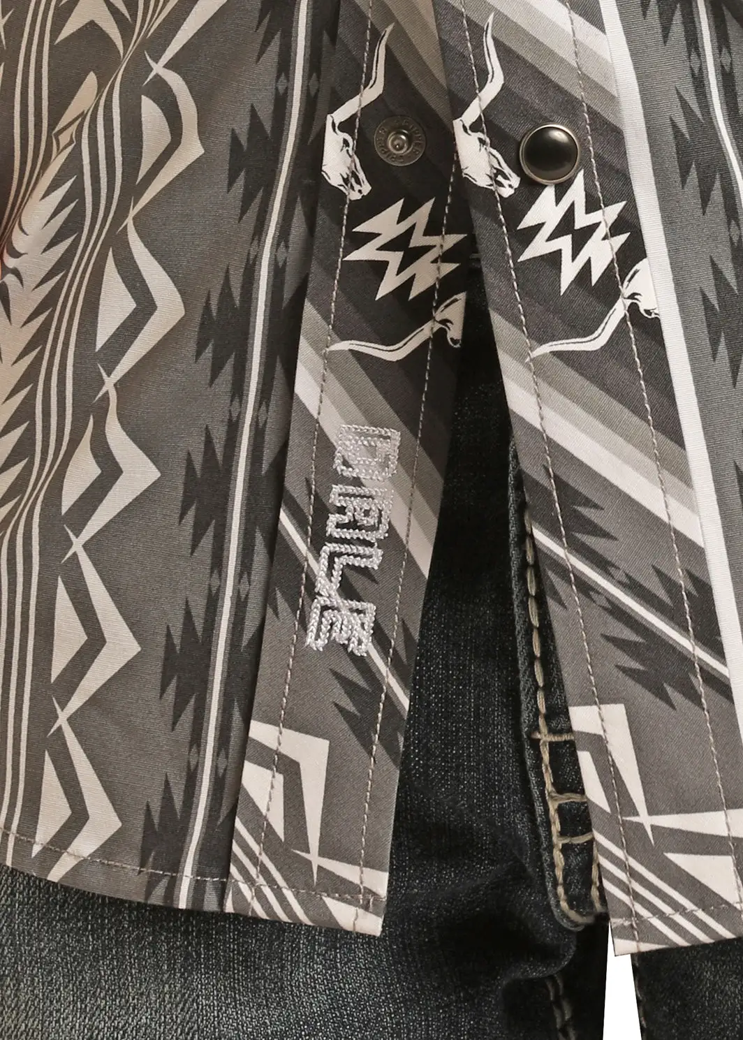Grey and White Aztec Stripe and Steer Head Print Long Sleeve Snap Front Shirt.