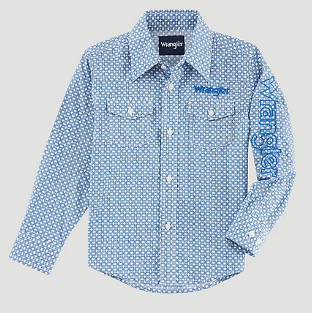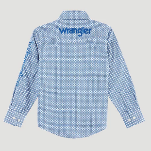 White Puff and Blue Print Long Sleeve Logo Snap Front Shirt.
