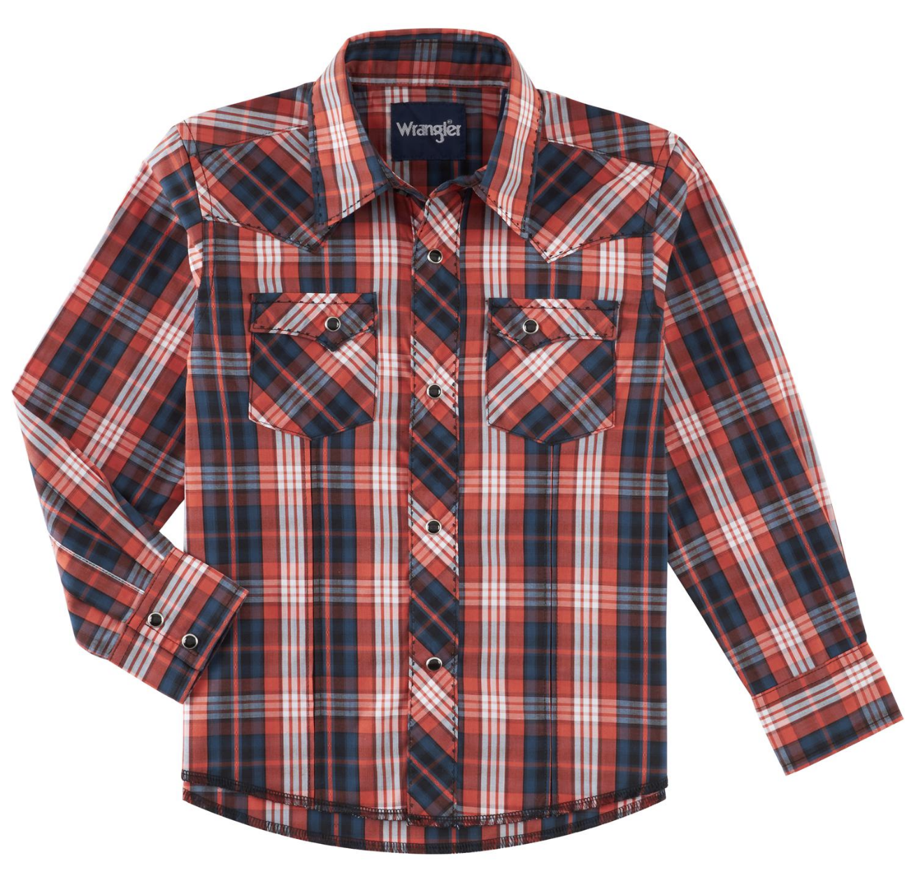 Orange and Blue Plaid Long Sleeve Snap Front Shirt.