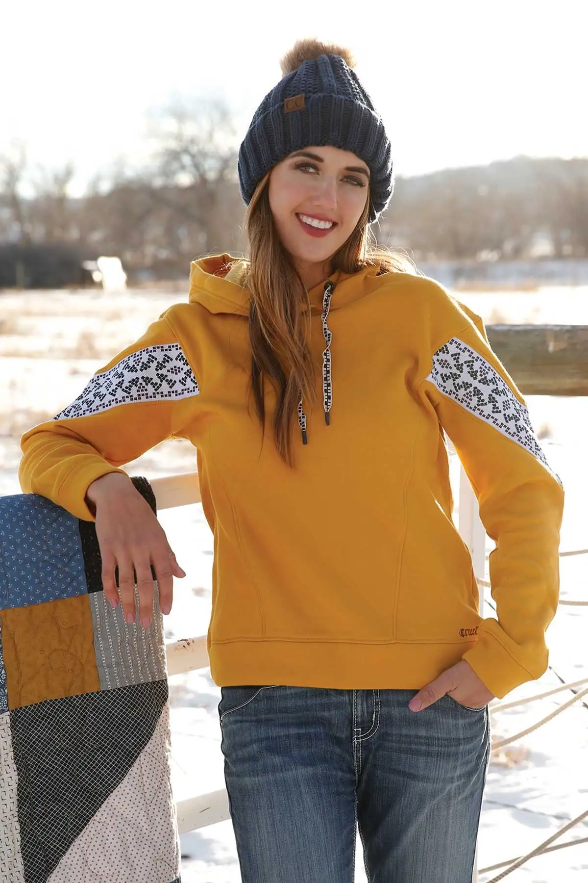 Gold Hoodie with Contrast Knit Piecing on Arms.