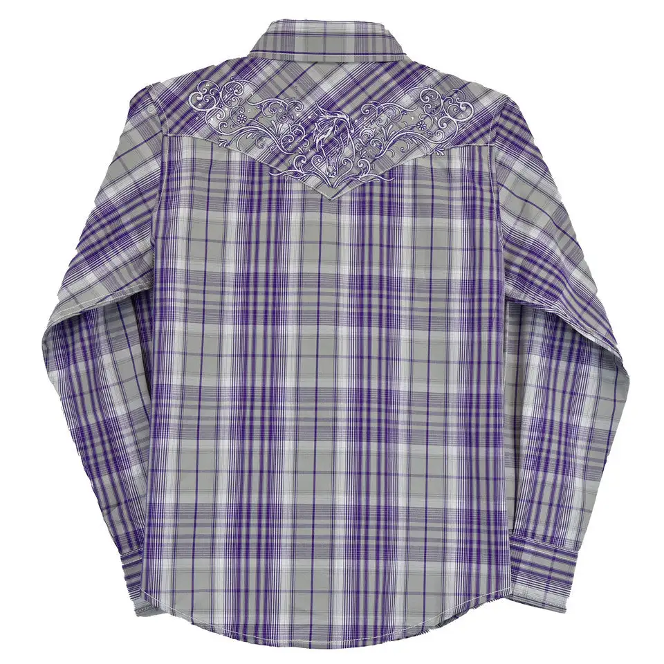 Purple and Grey Plaid Long Sleeve Snap Front with Yoke Detail.