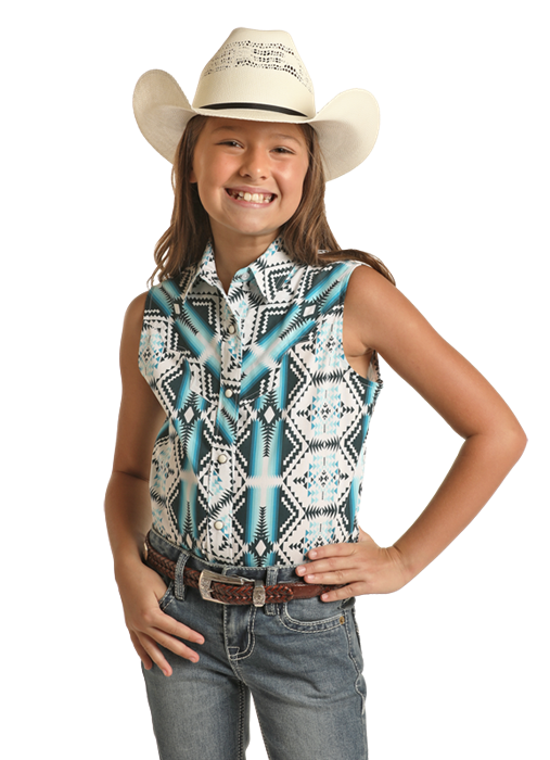 Teal and White Aztec Print Sleeveless Snap Front Shirt.