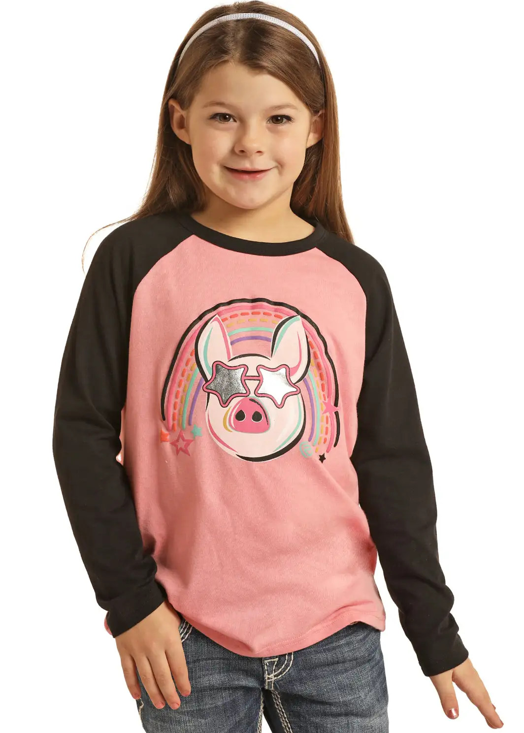 Black and Pink Long Sleeve Baseball T-Shirt with Pig and Rainbow Graphic.
