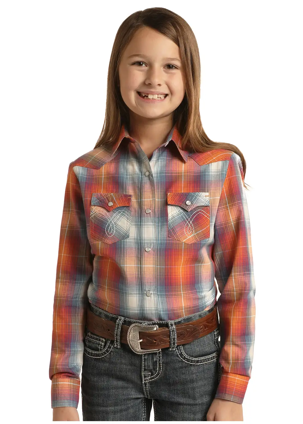 Orange and Blue Ombre Plaid Long Sleeve Snap Front Shirt.
