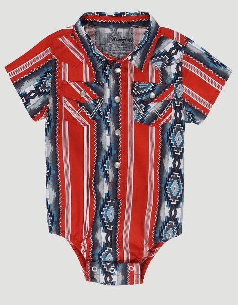 Cherry Pie Red and Blue Aztec Stripe Short Sleeve Bodysuit.