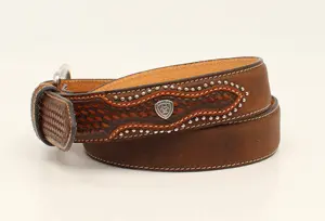 Brown Distressed Leather Belt with Basketweave Stamped Tabs Outlind in Silver Nailheads.