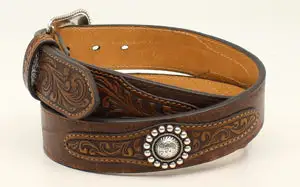 Brown Distressed Leather Belt with Floral Embossed Overlay and Western Style Silver Concho.