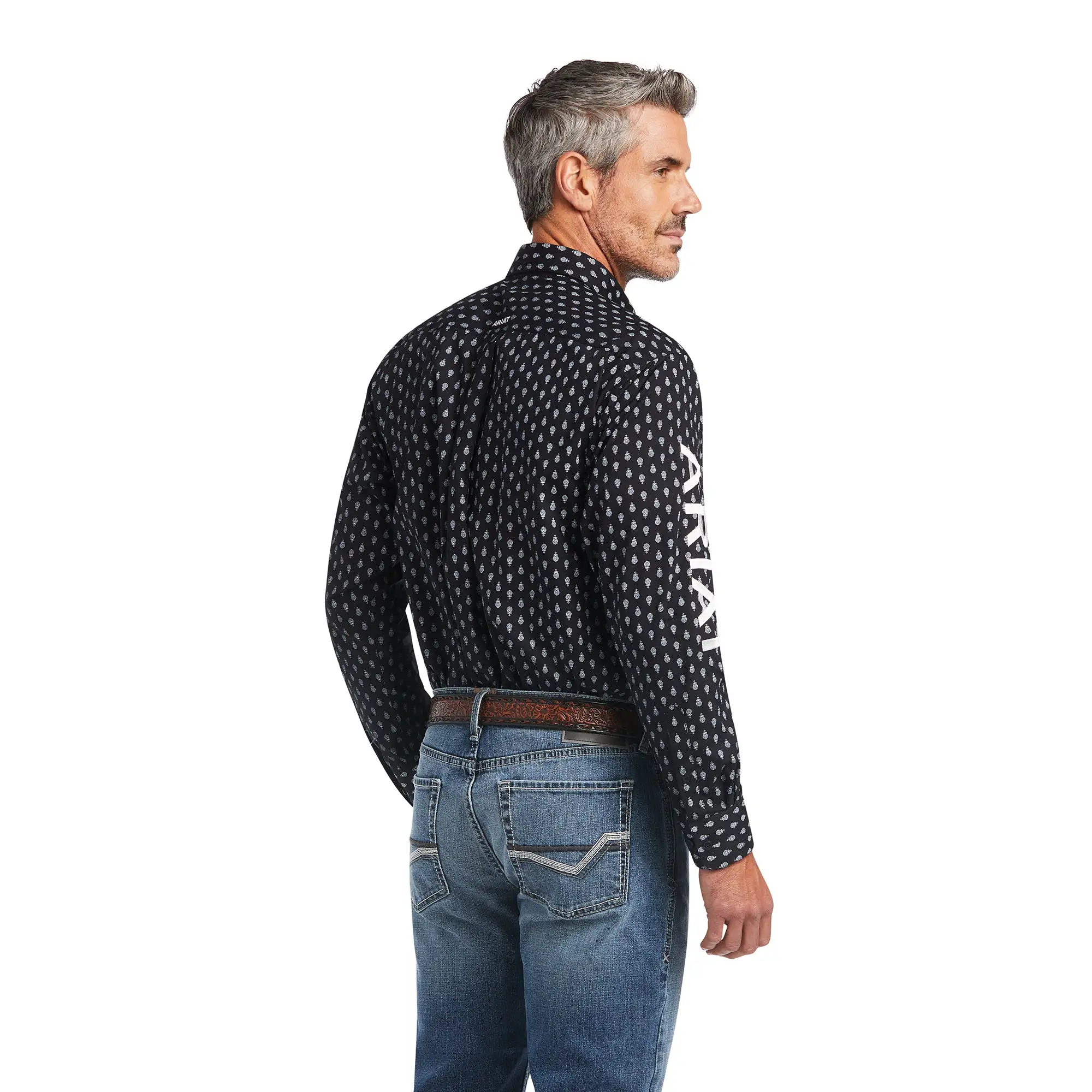Black with White Print Long Sleeve Team Raine Classic Fit Button Down Shirt.