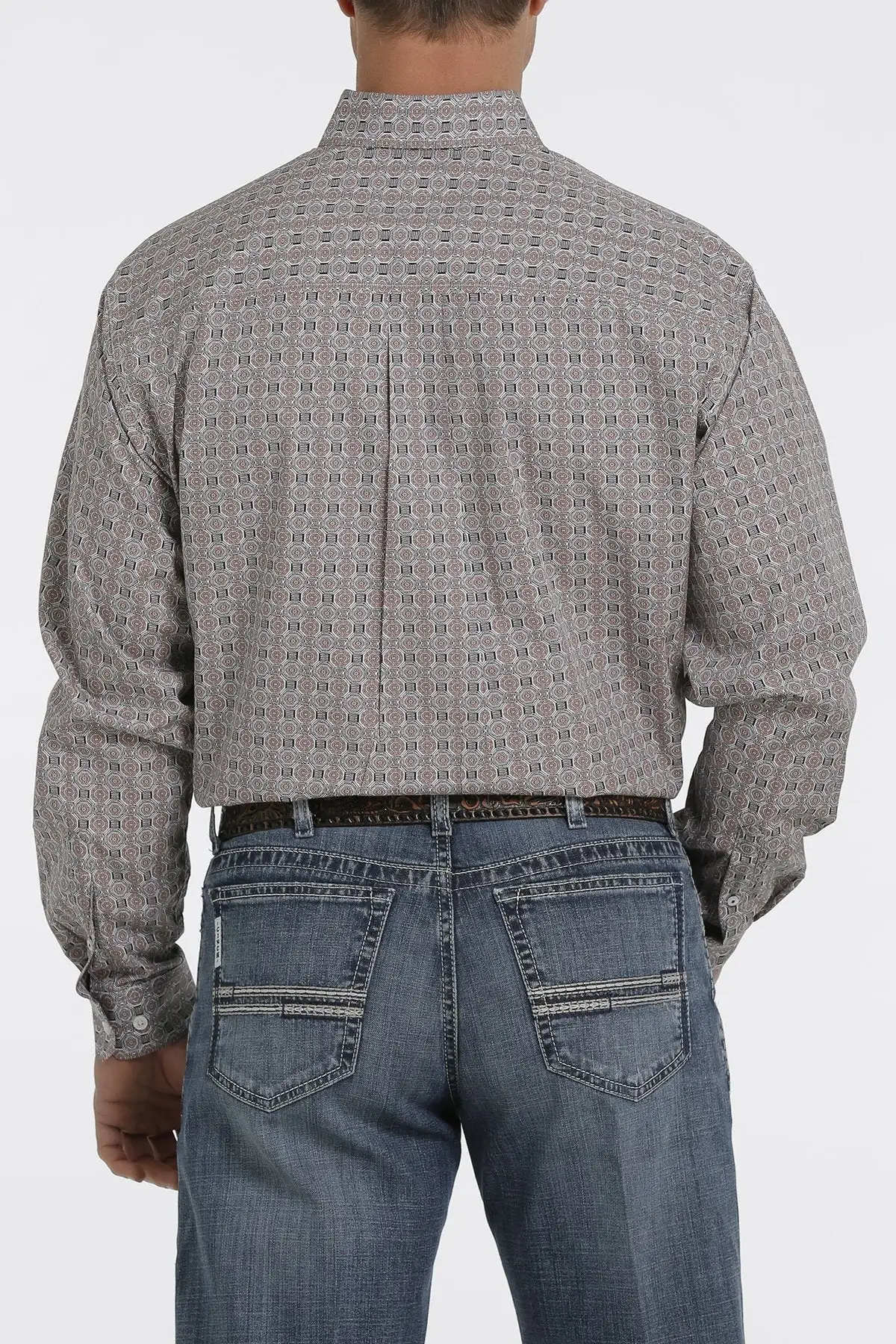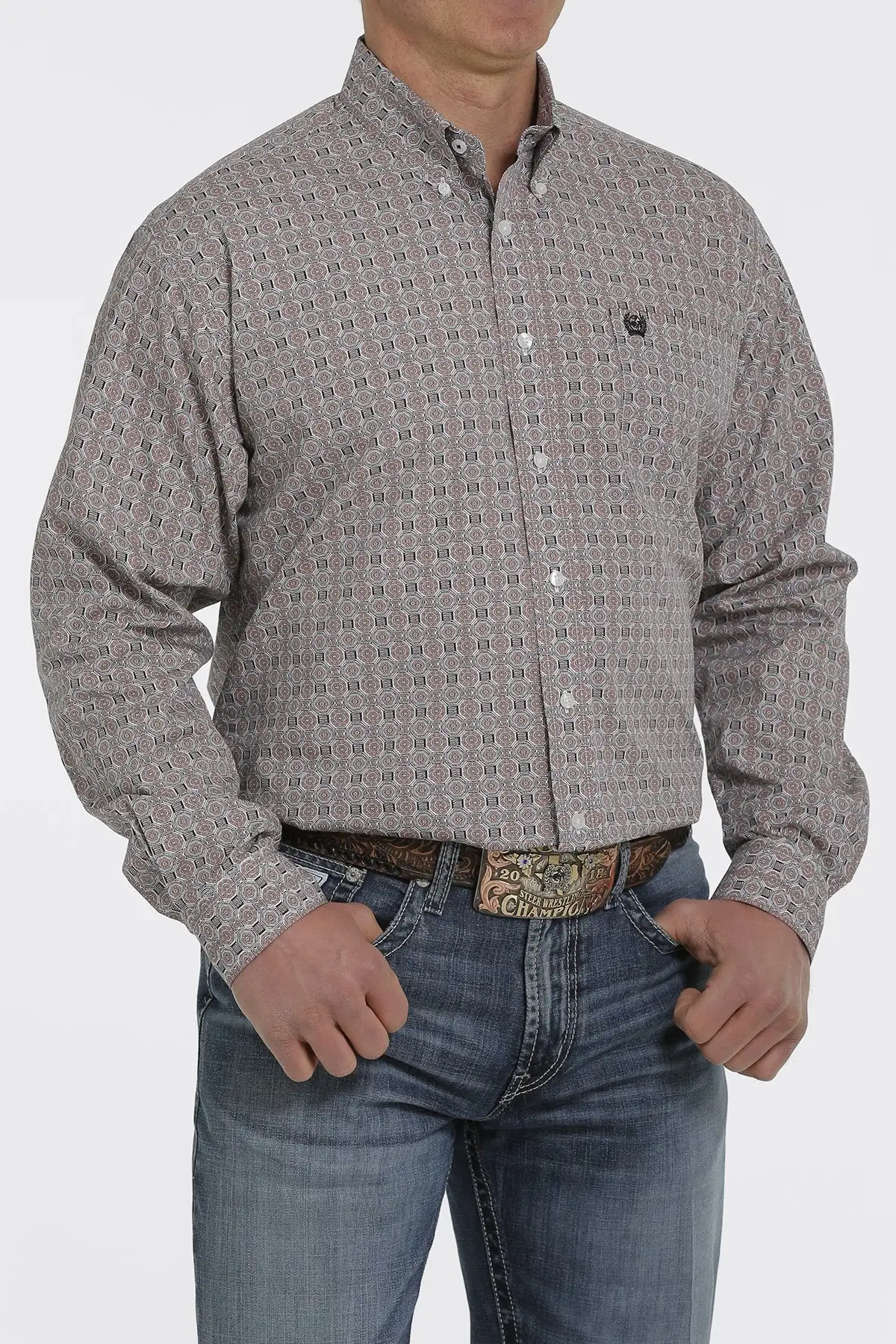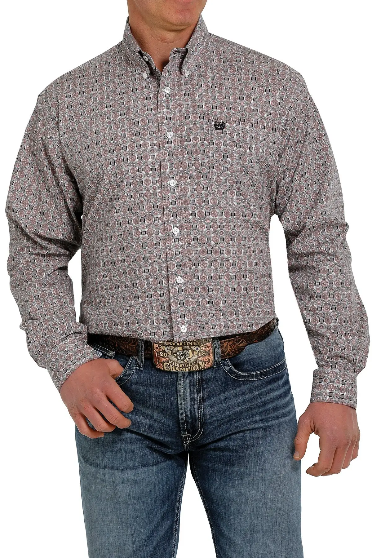 Pink and White Medallion Print Long Sleeve Button Down Shirt.