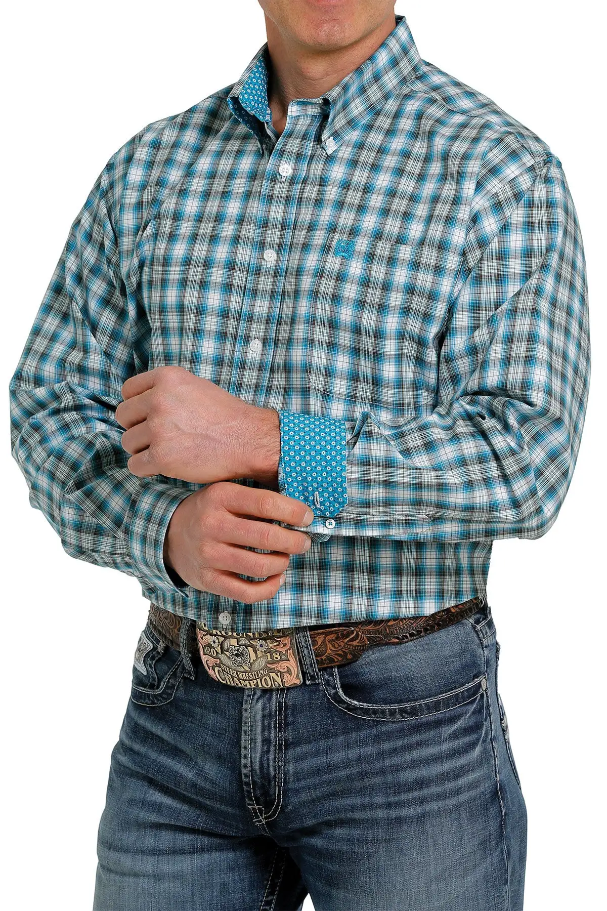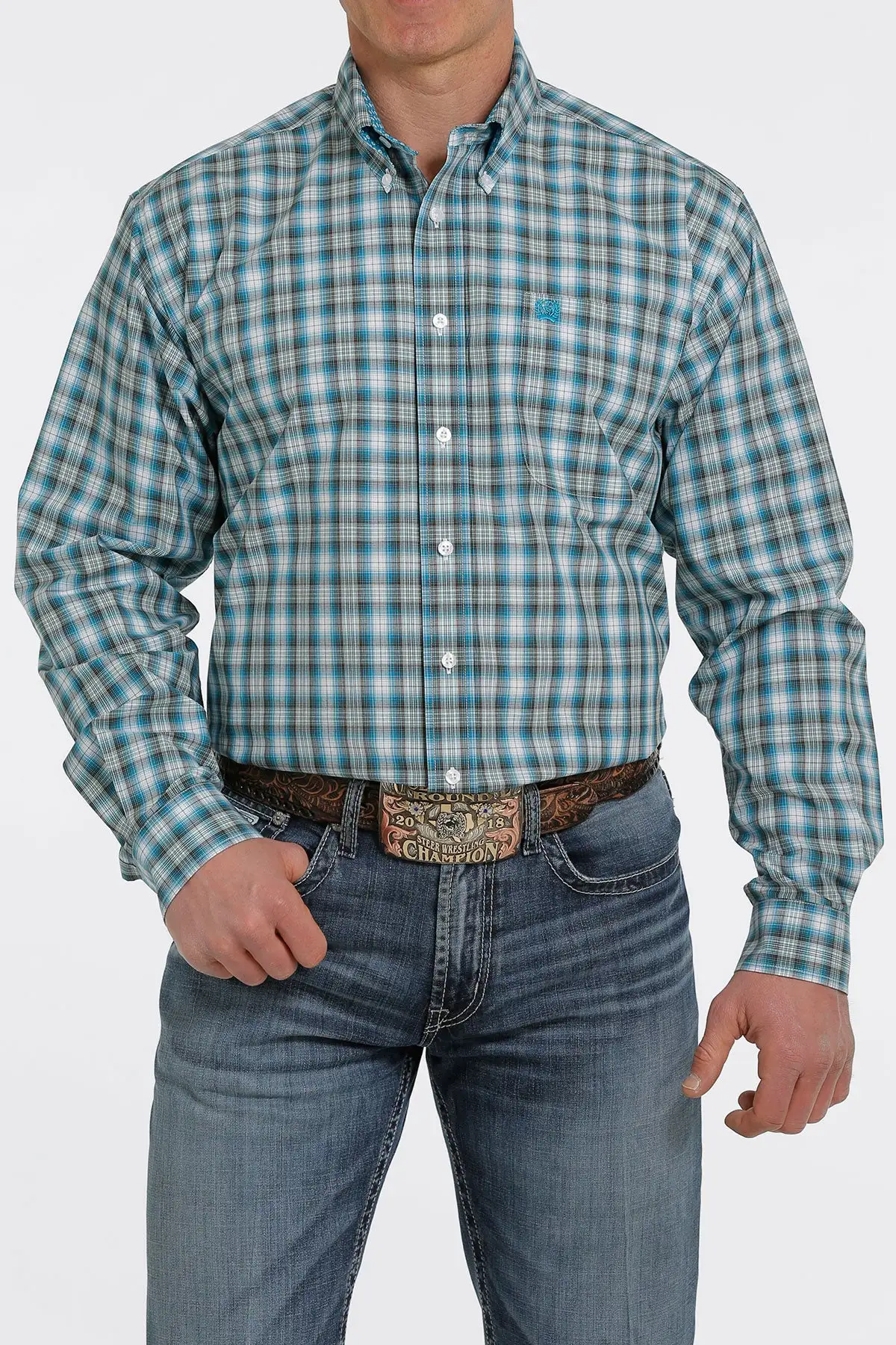 Turquoise and White Plaid Long Sleeve Button Down Shirt.