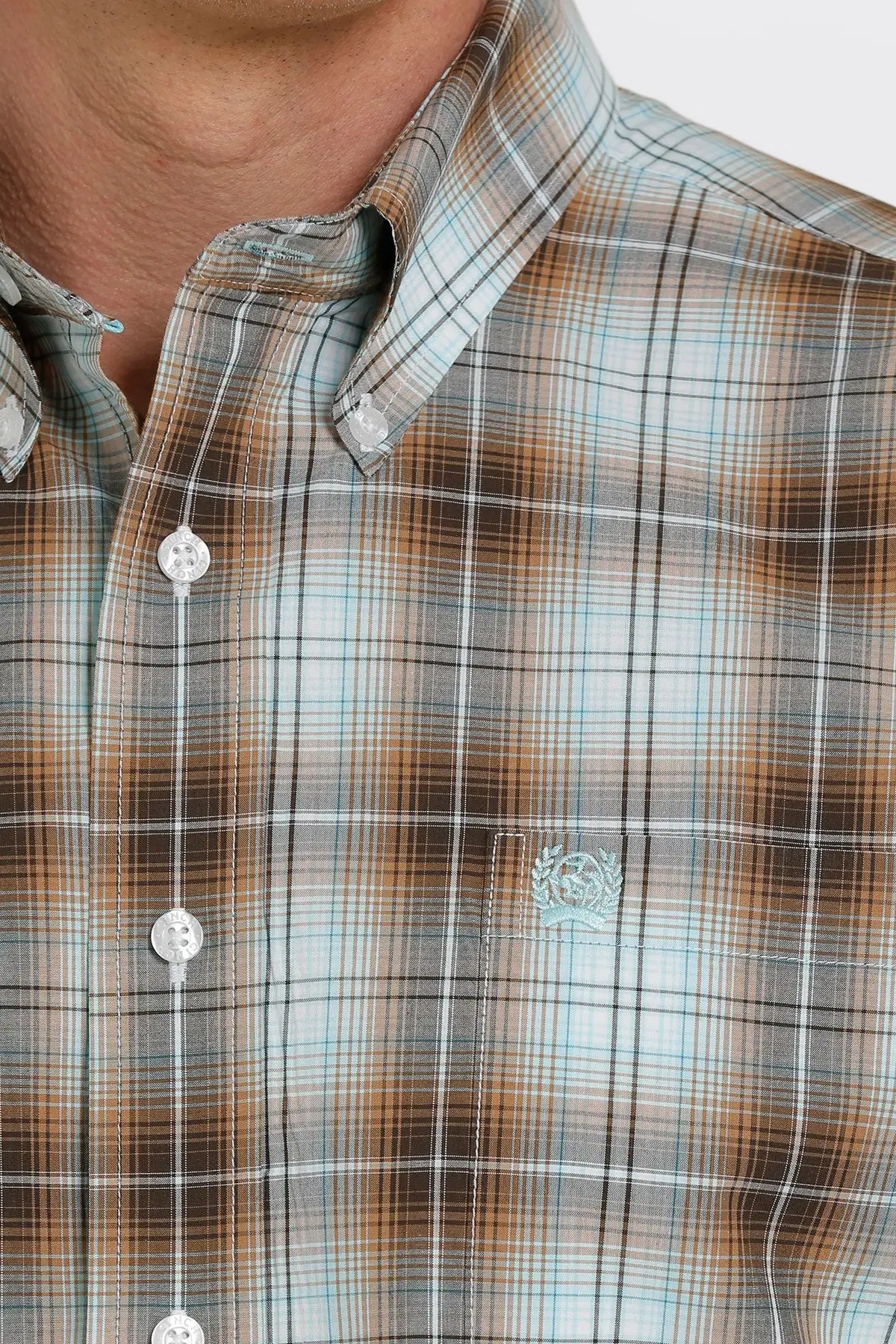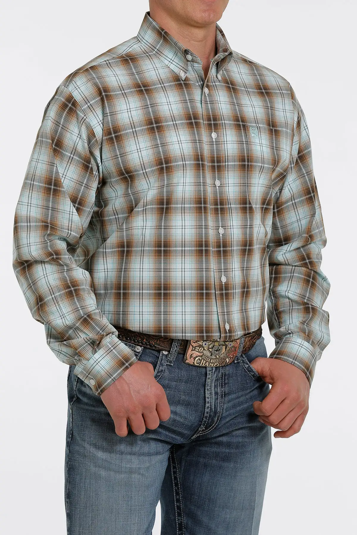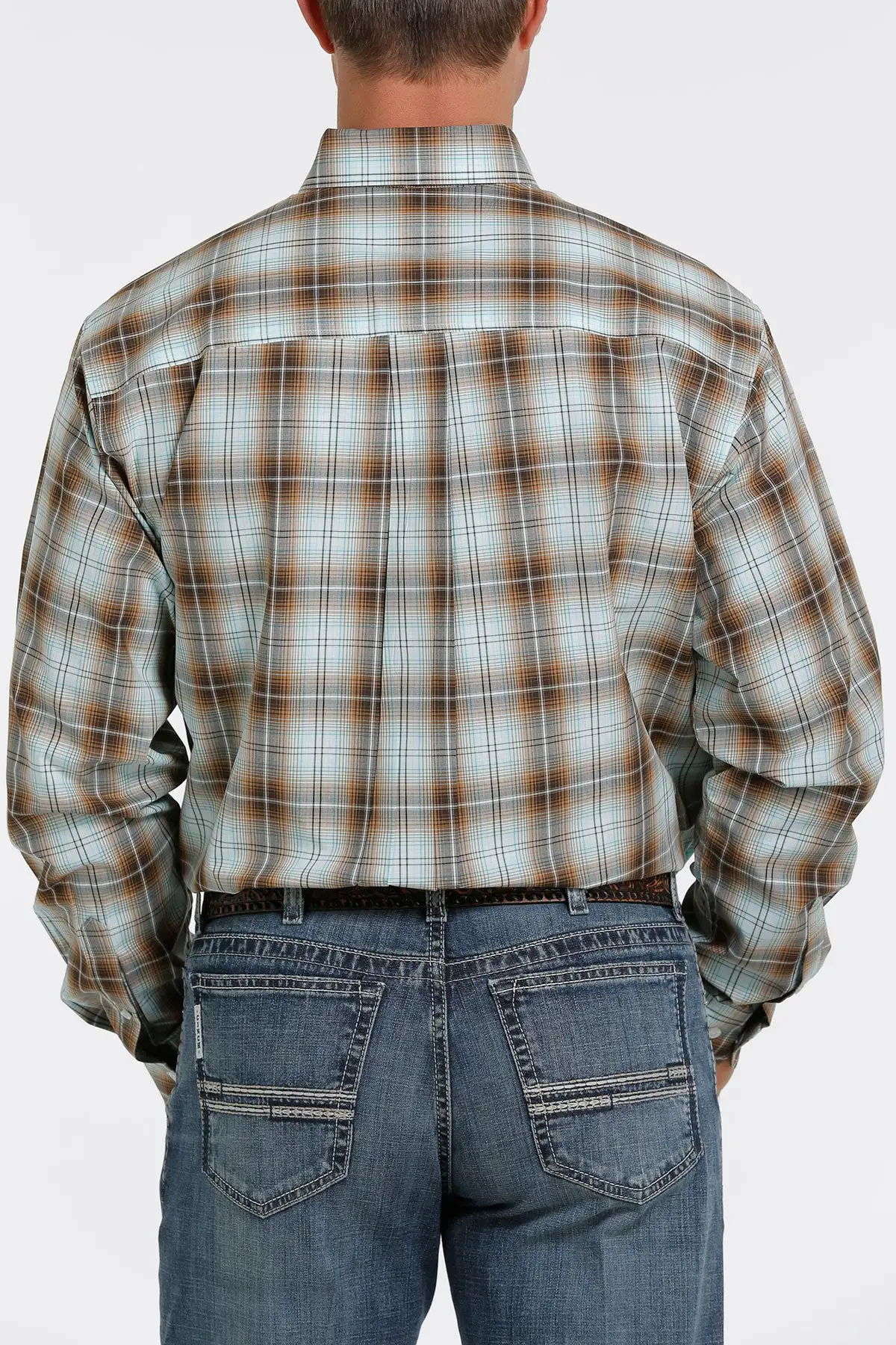 Brown and Turquoise Ombre Plaid Long Sleeve Button Down Shirt.
