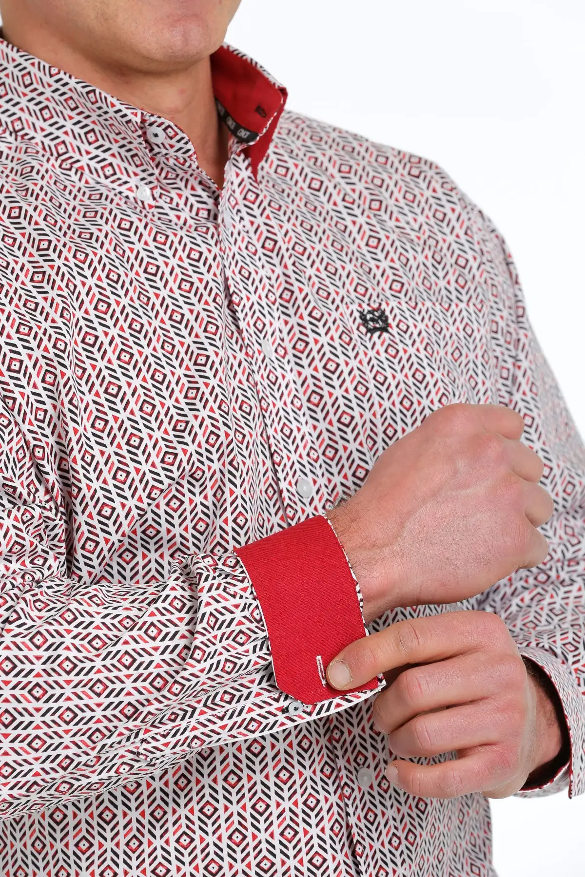 White, Black and Red Geometric Print Long Sleeve Button Down Shirt.