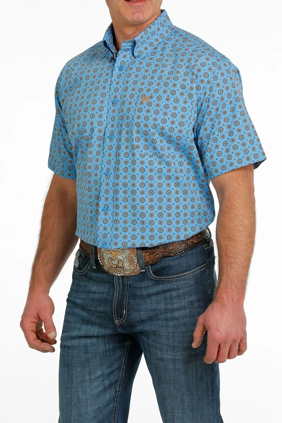 Blue, Gray and White Medallion Print Short Sleeve Button Down Shirt.