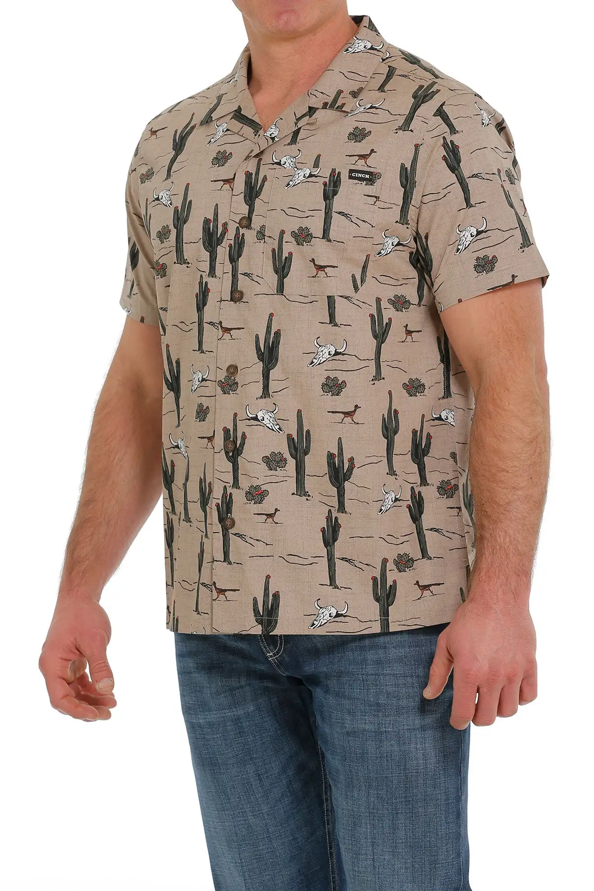 Khaki with Cactus and Skull Desert Print Short Sleeve Button Down Shirt.