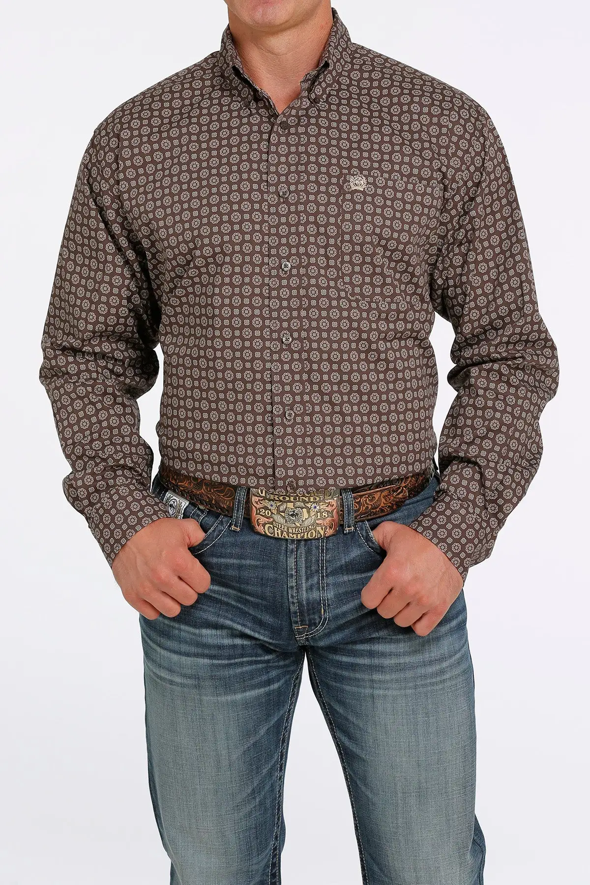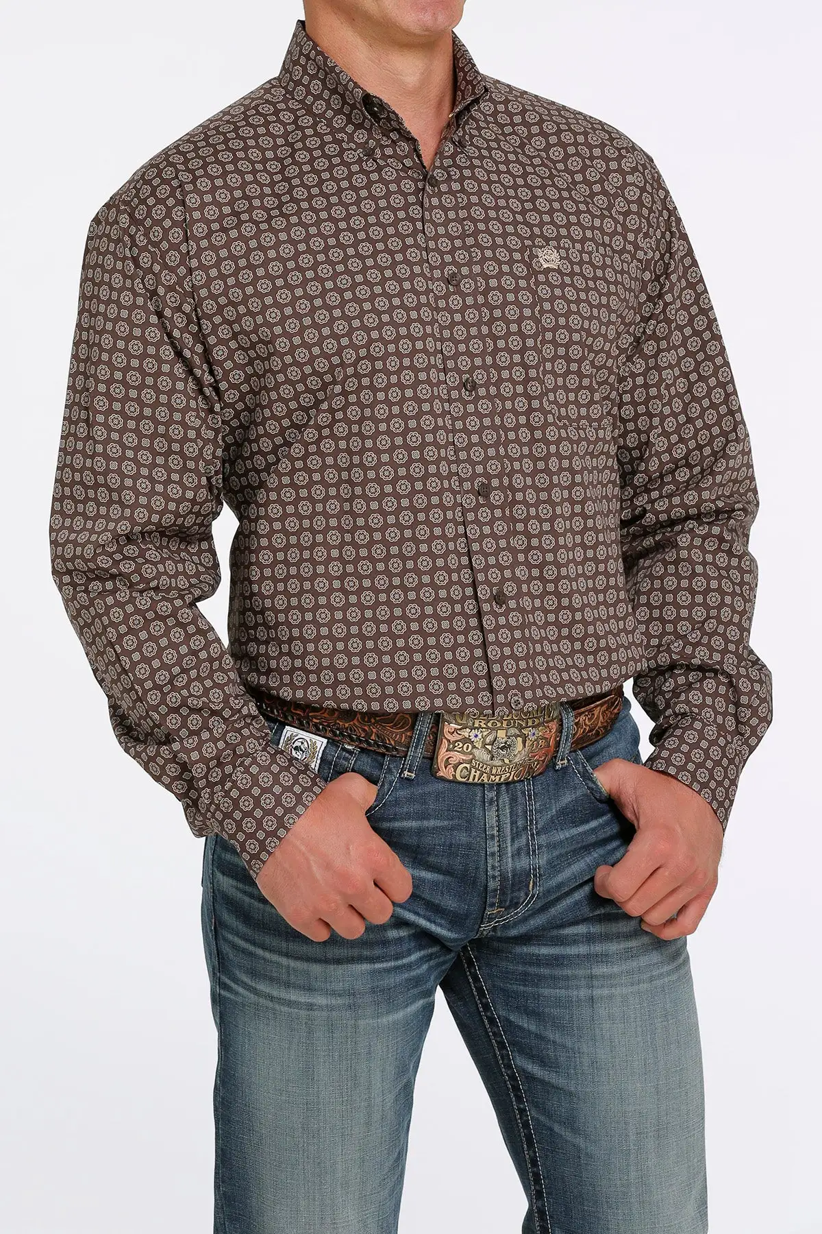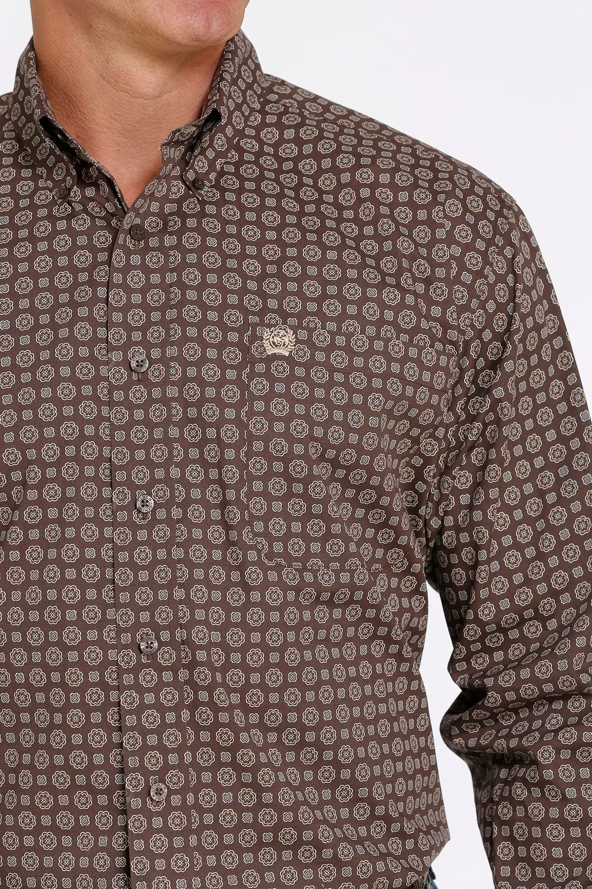 Brown and Aqua Medallion Print Long Sleeve Stretch Button Down Shirt.