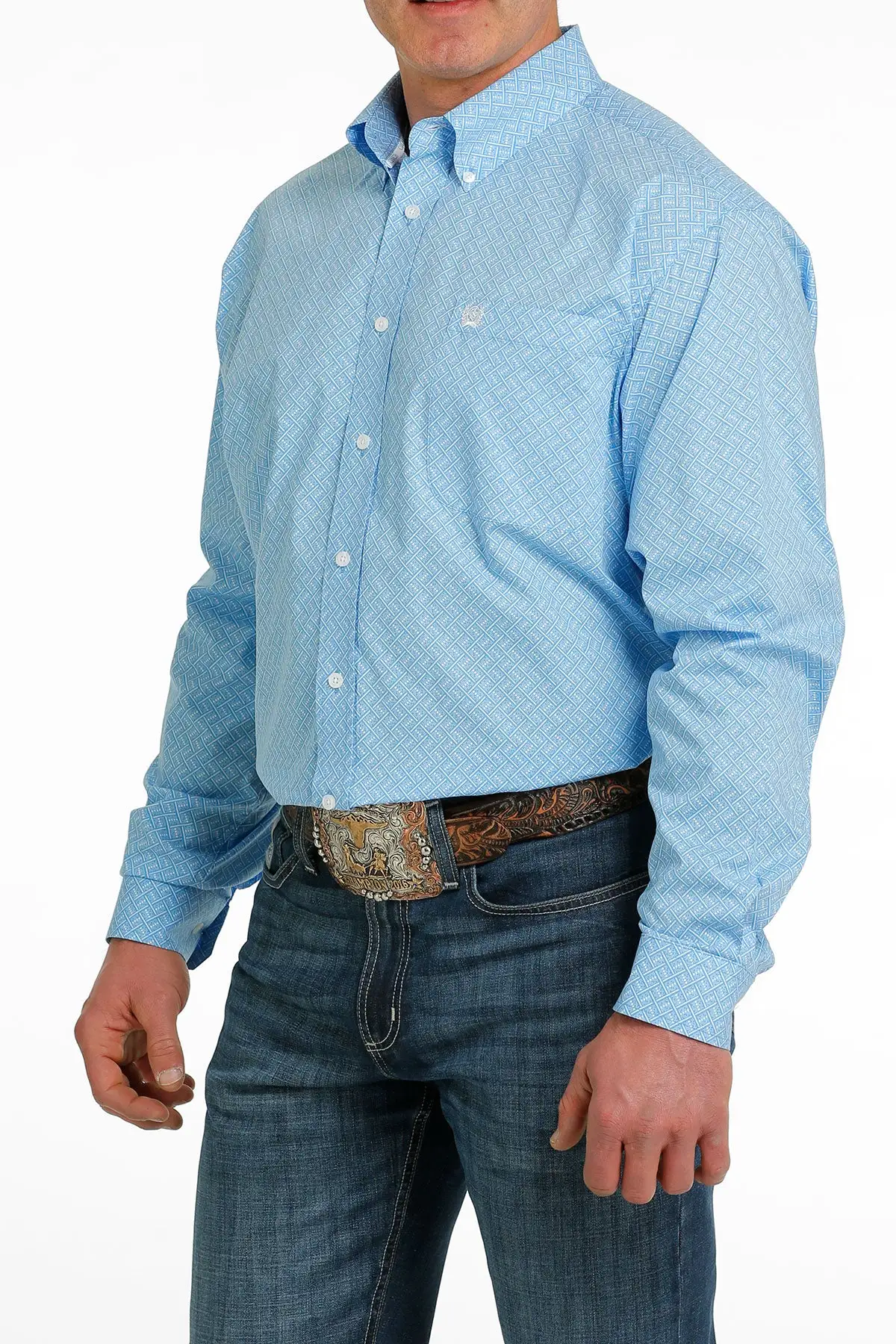 Blue and White Diamond Print Long Sleeve Stretch Button Down Shirt.