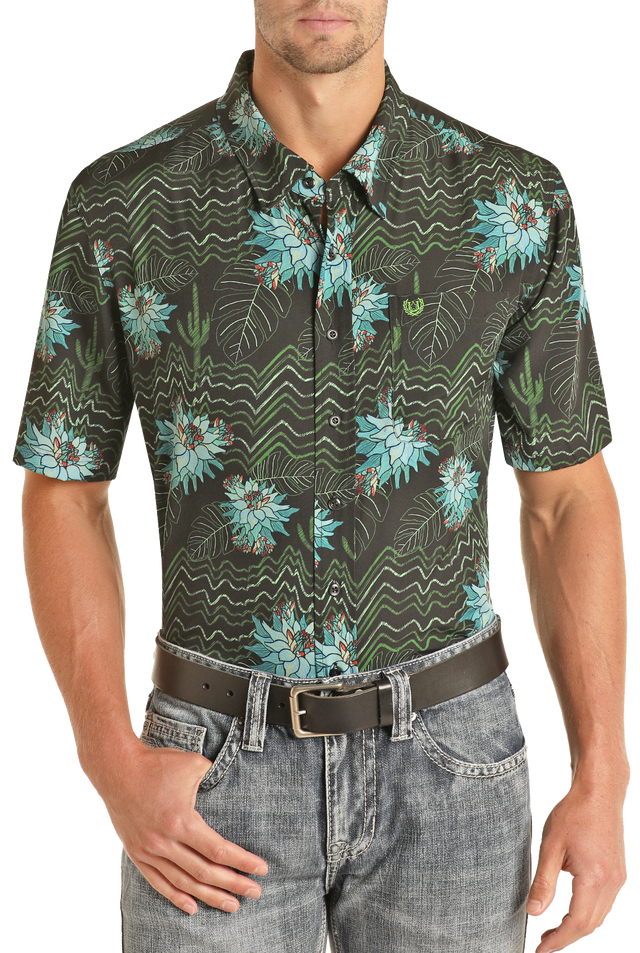 Black with Green and Blue Tropical Print Short Sleeve Button Down Shirt.