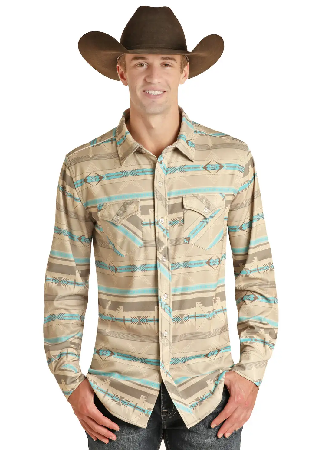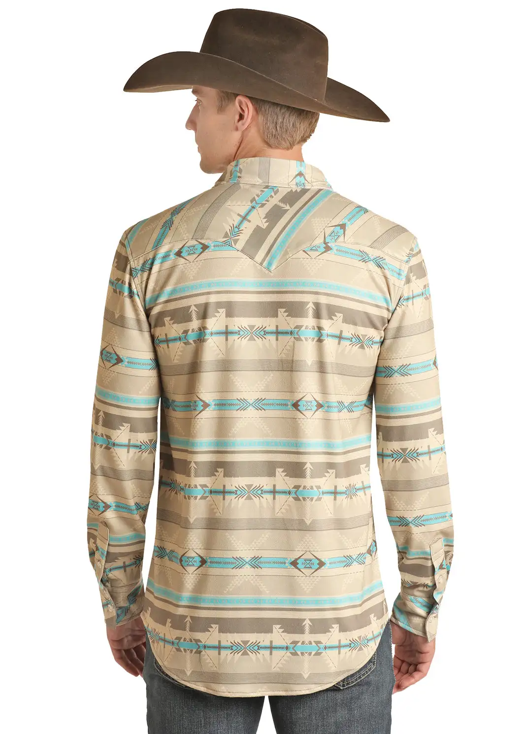 Tan and Turquoise Aztec Stripe Long Sleeve Button Down Shirt.