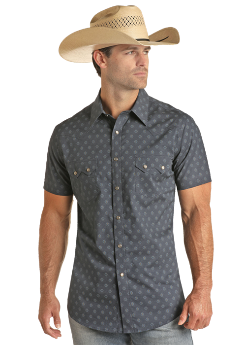 Blue Medallion Vintage Print Short Sleeve Snap Front Shirt.