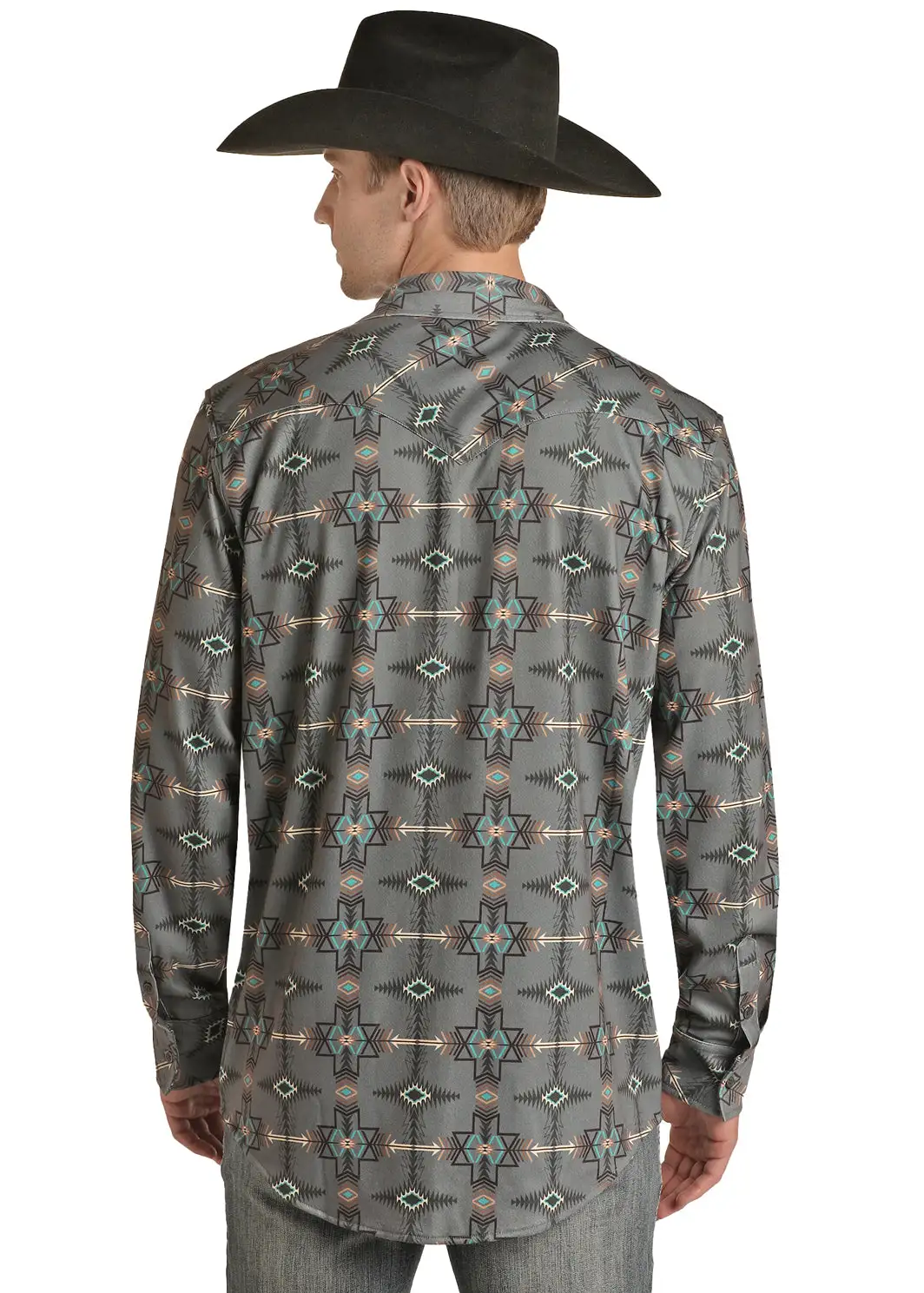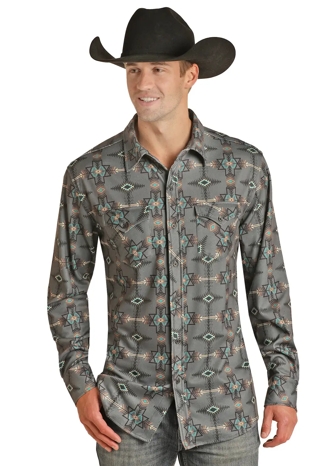 Grey with All Over Aztec Print Long Sleeve Snap Front Shirt.