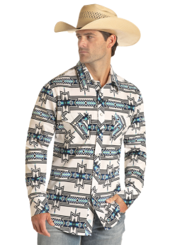 White with Blue and Grey Aztec Print Long Sleeve Snap Front Shirt.