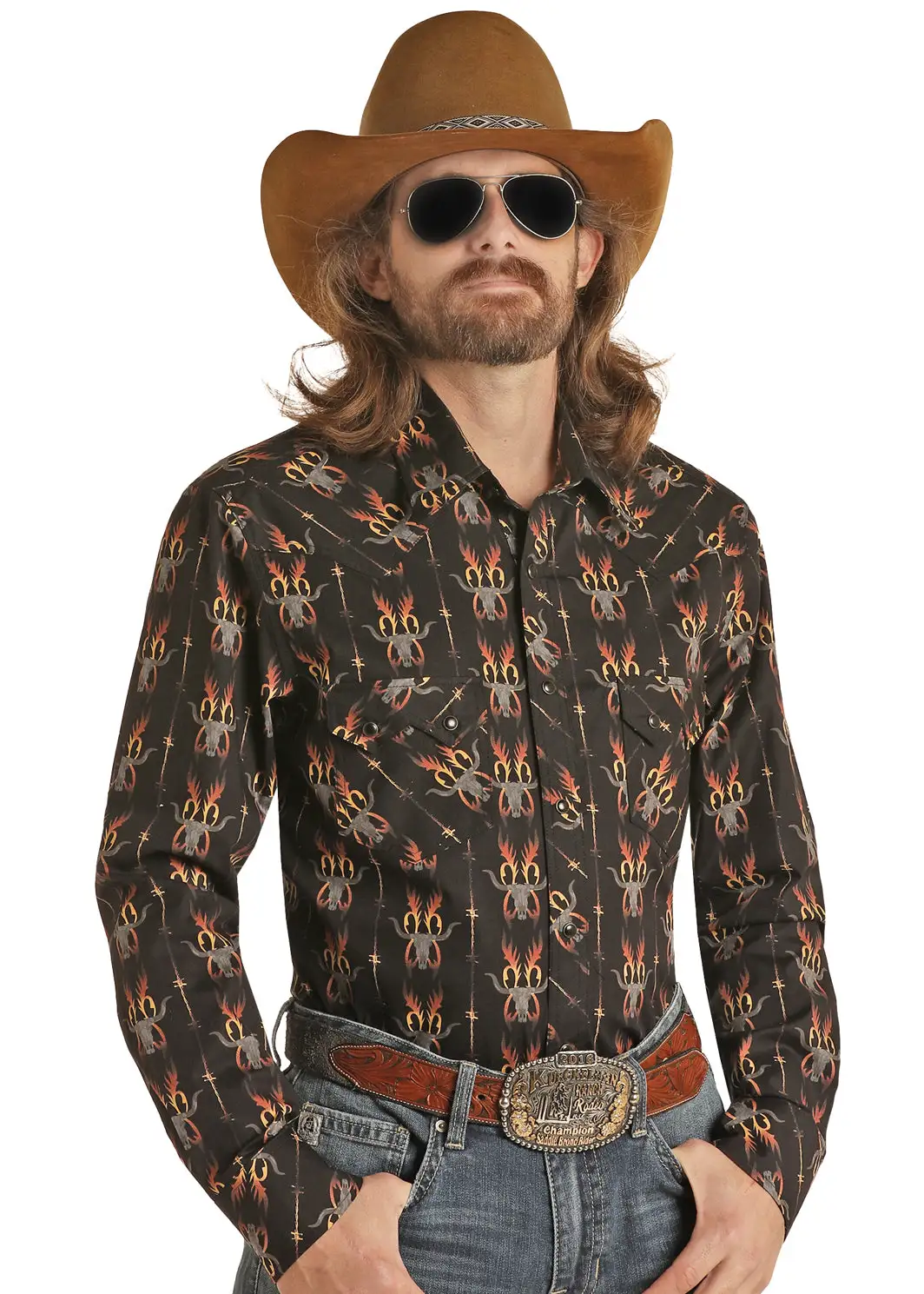 Black with Fire and Steer Head Print Long Sleeve Snap Front Shirt.