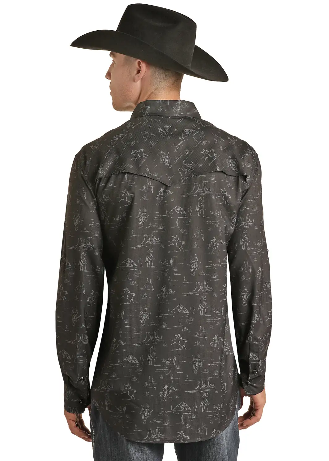 Black with Silver Overlay Western Print Long Sleeve Tec Western Snap Front Shirt.