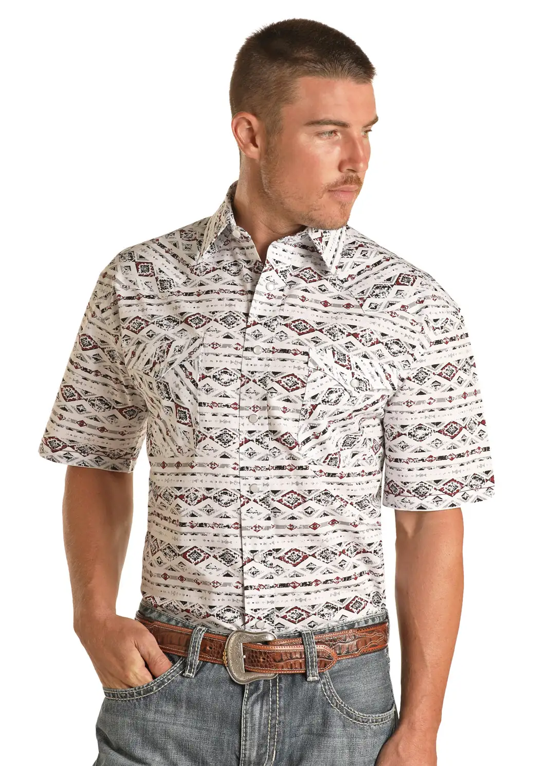White with Steel Grey and Red Aztec Print Short Sleeve Snap Front Shirt.