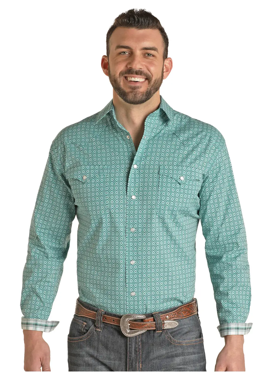Light Blue and Turquoise Medallion Print Long Sleeve Snap Front Shirt.