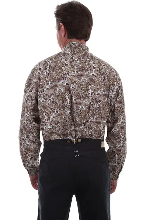 Brown and White Paisley Long Sleeve Button Down Shirt.