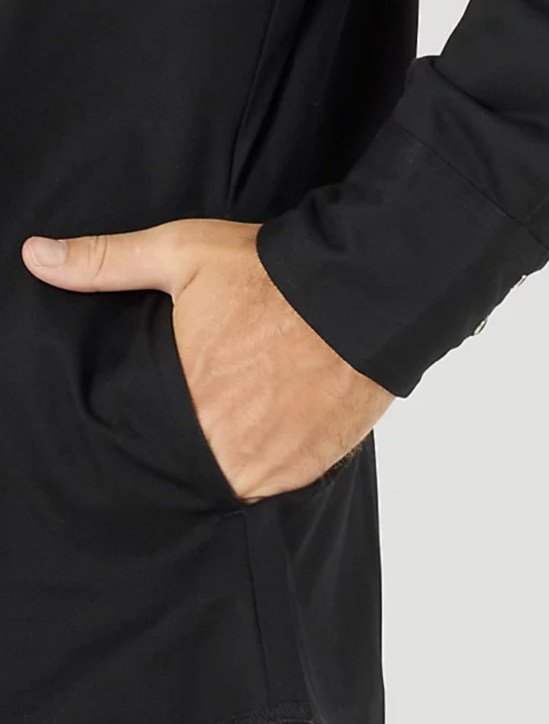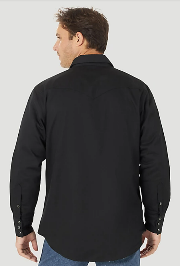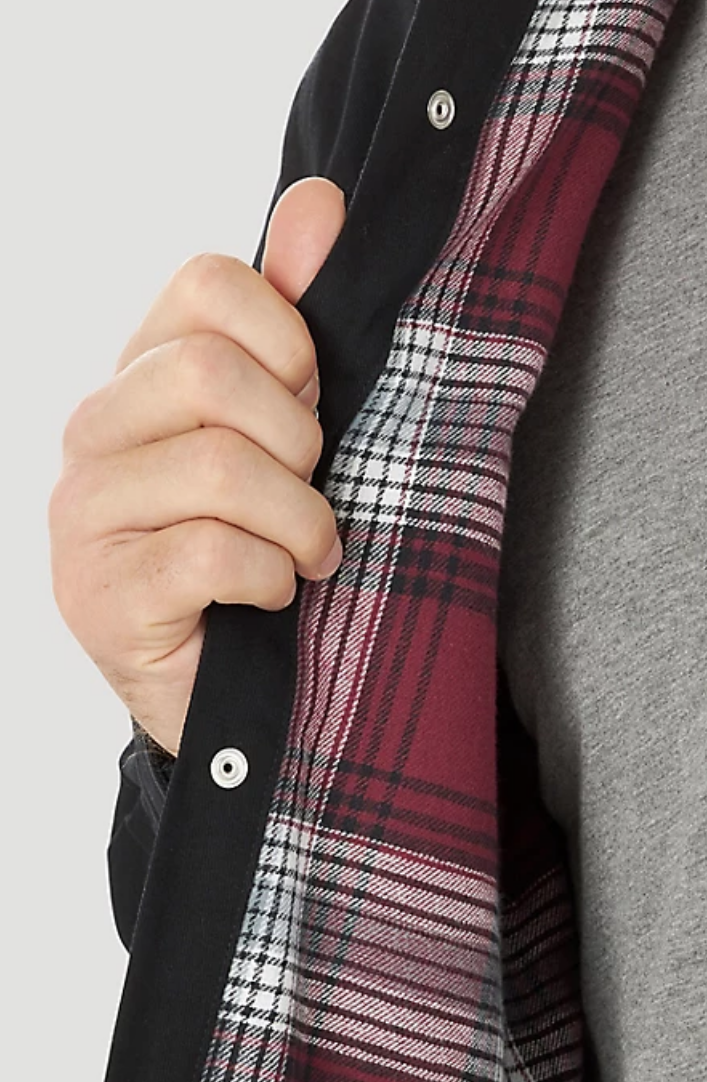 Black Long Sleeve Burgundy Plaid Flannel Lined Snap Front Work Shirt.