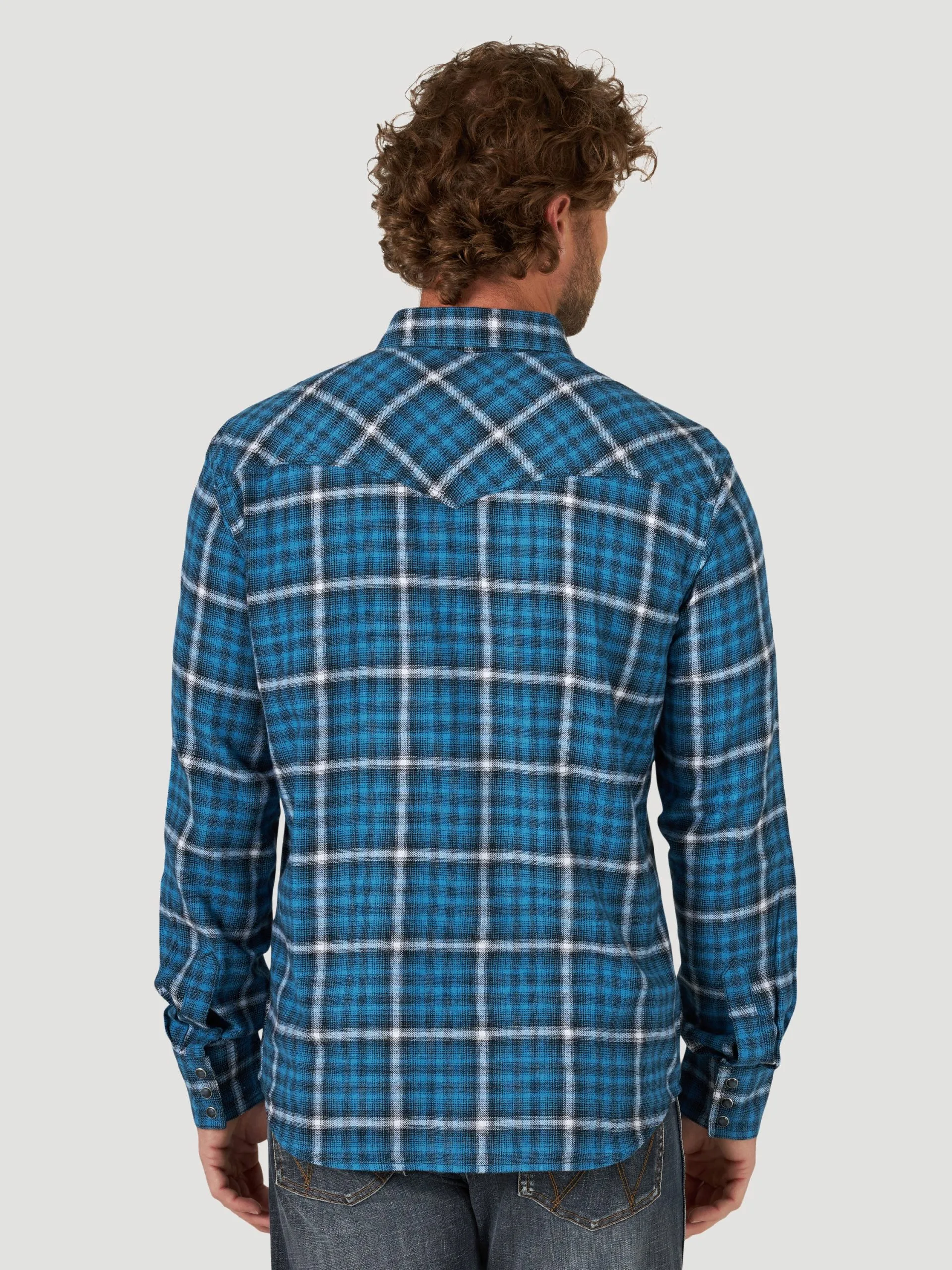 Blue Cat Plaid Flannel Long Sleeve Snap Front Shirt.