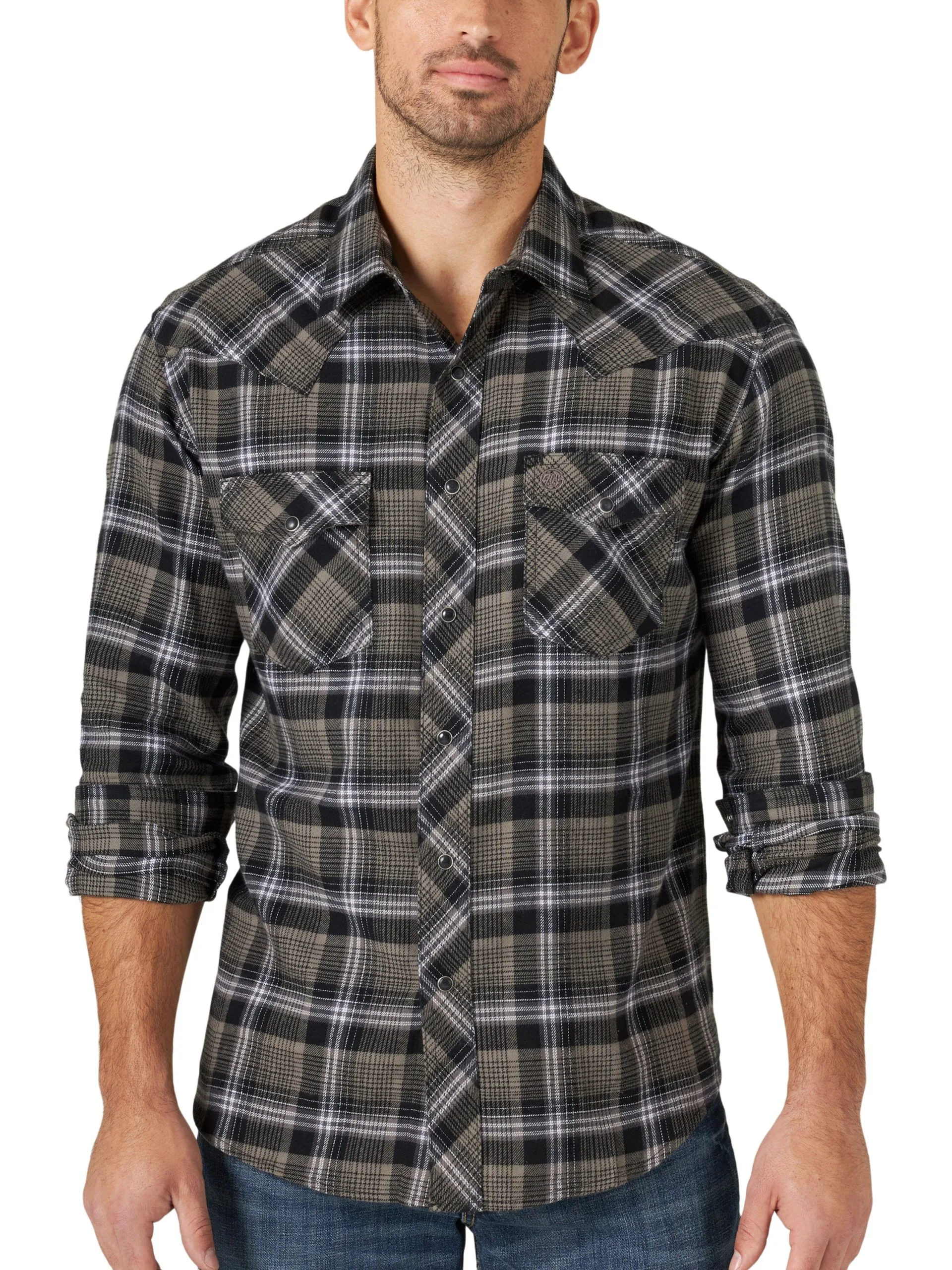 Black Plaid Long Sleeve Retro Snap Front Flannel Shirt.
