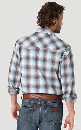 Brown and Blue Plaid Long Sleeve Snap Front Shirt.