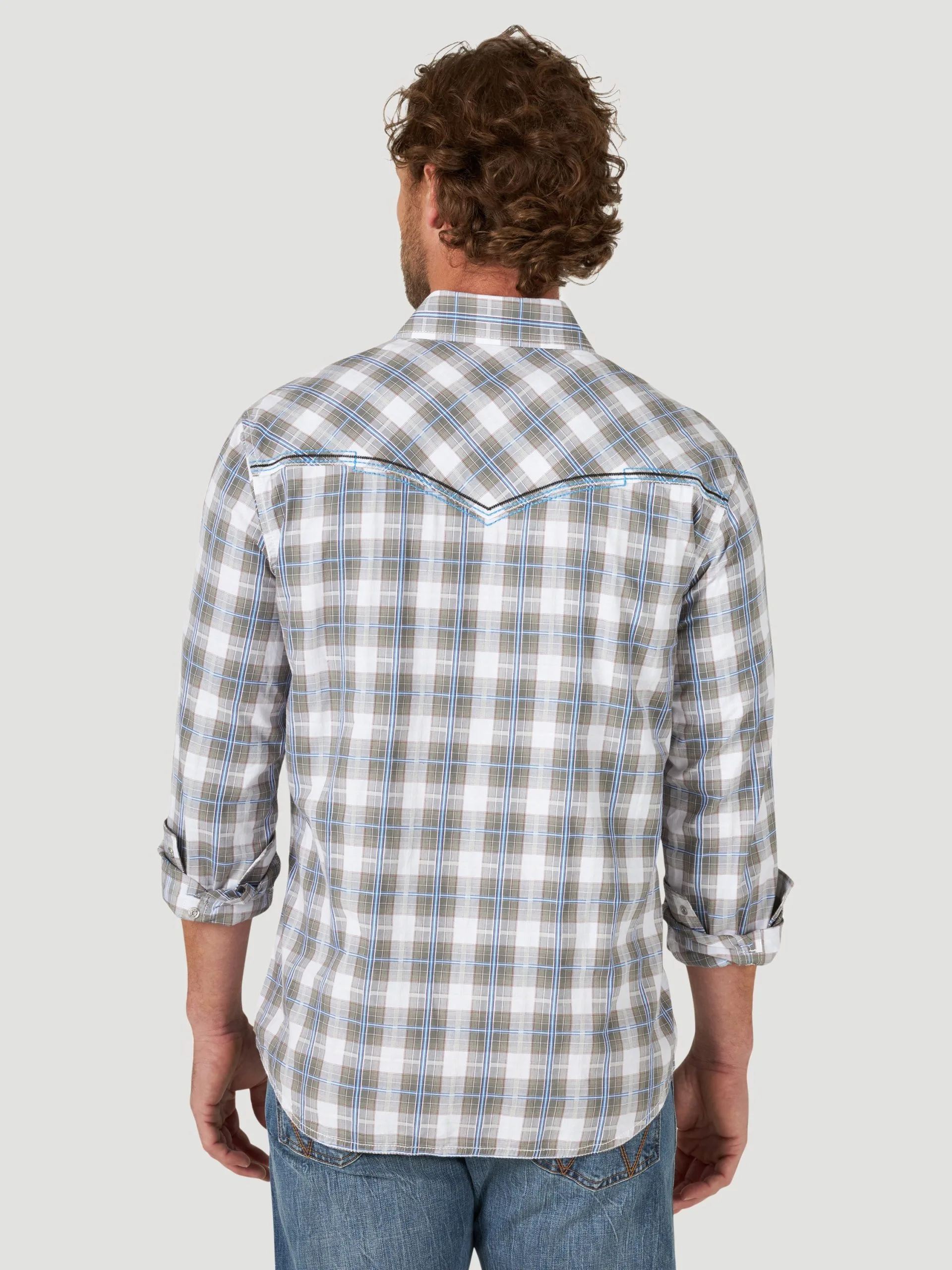 Frosted Grey Plaid Long Sleeve Snap Front Shirt with Embroidered Yoke and Pockets.