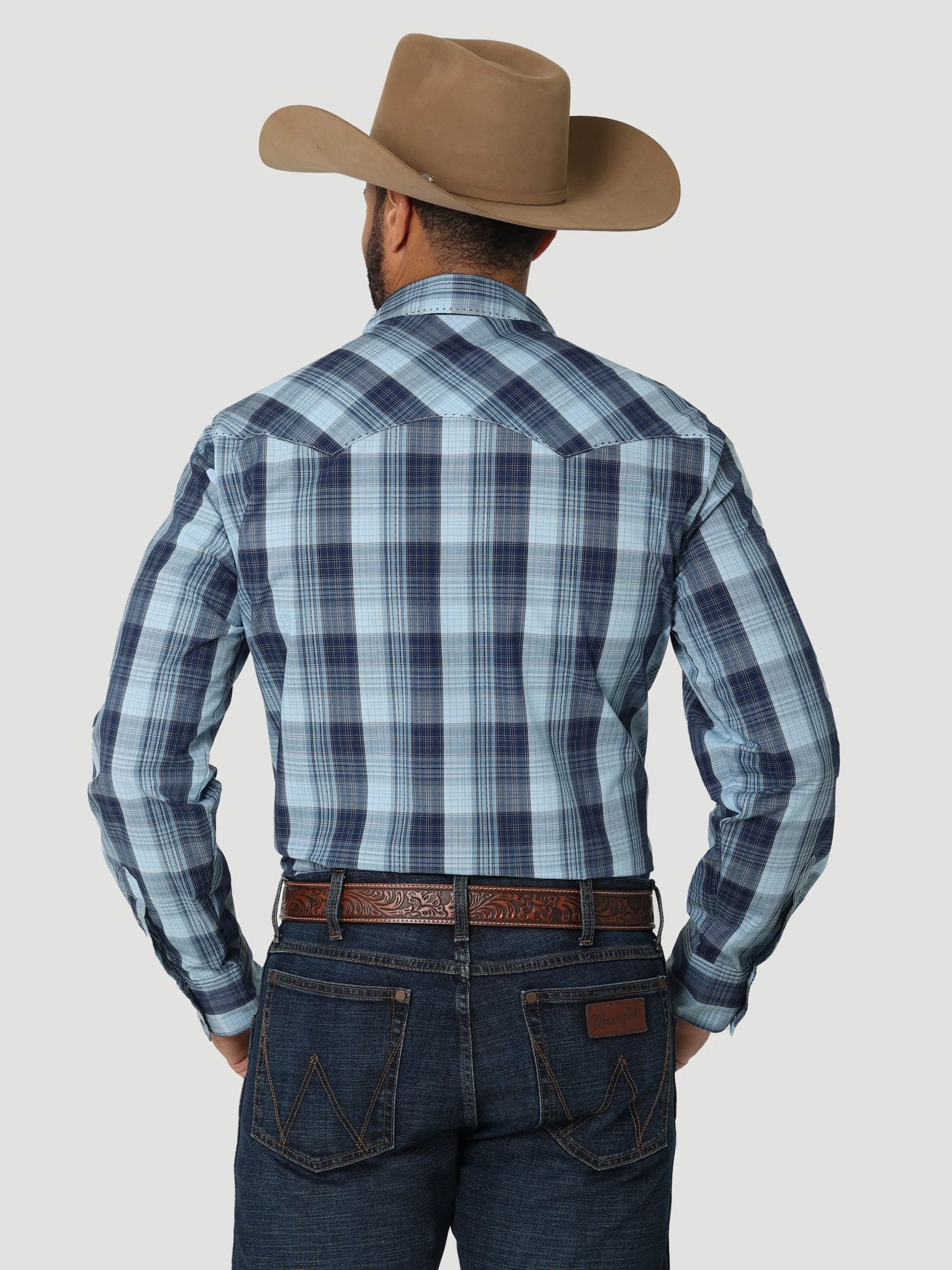Meditative Blue Plaid Long Sleeve Snap Front Shirt.