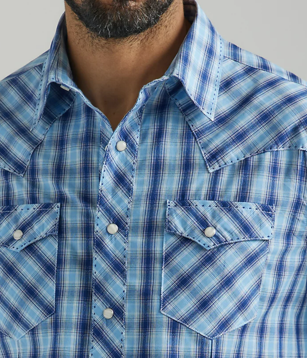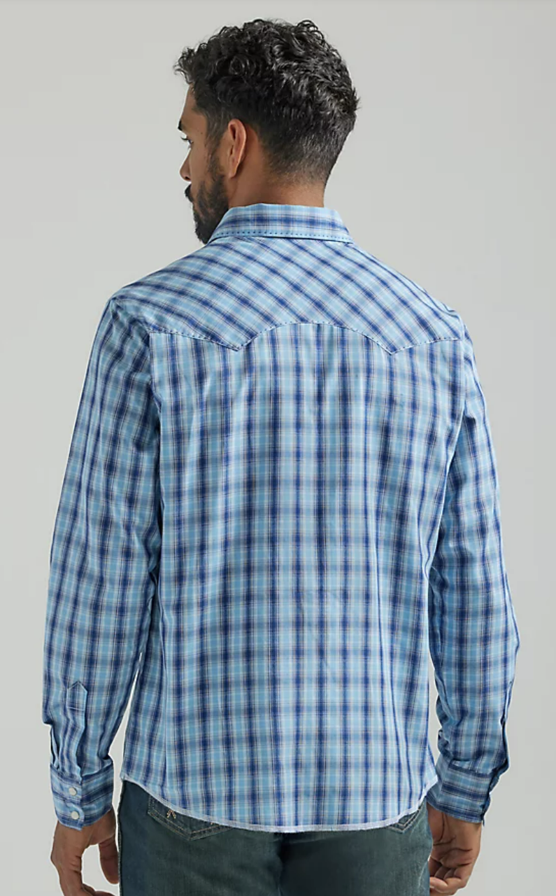 Navy Blue Plaid Long Sleeve Snap Front Shirt.