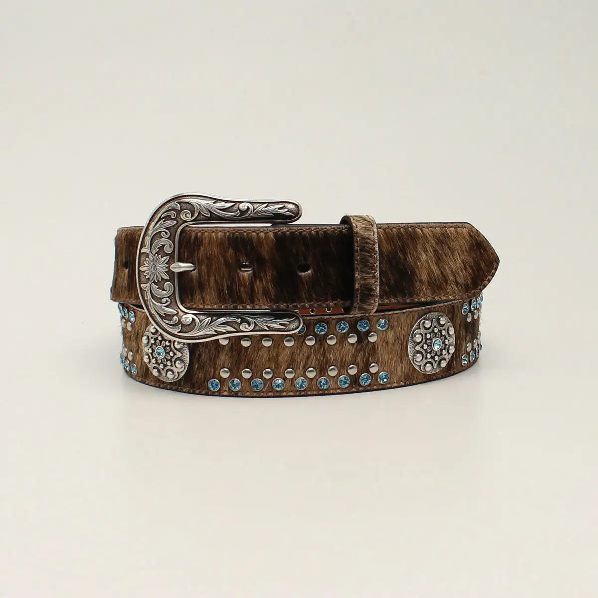 Brown Leather Western Belt with Calf Hair Lined with Aqua Color Rhinestones and Silver Studs Down the Edges.