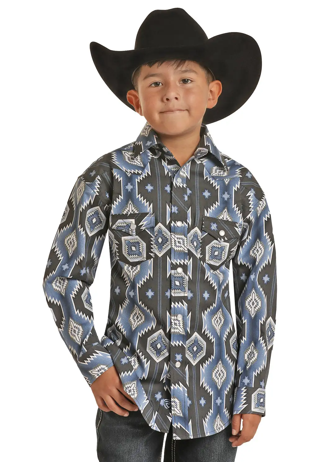 Blue and Charcoal Aztec Print Long Sleeve Snap Front Shirt.