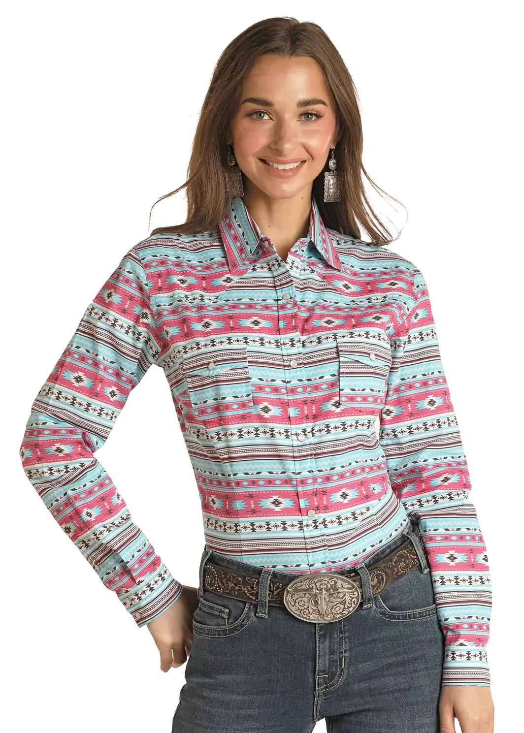 Pink and Light Blue Aztec Stripe Long Sleeve Snap Front Shirt.
