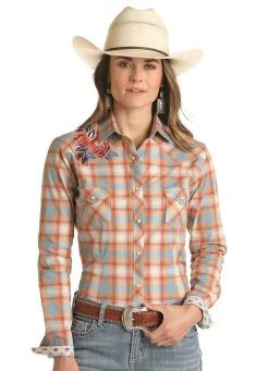 Peach, Red and Blue Plaid Long Sleeve Snap Front Shirt with Flower Embroidery Detail.