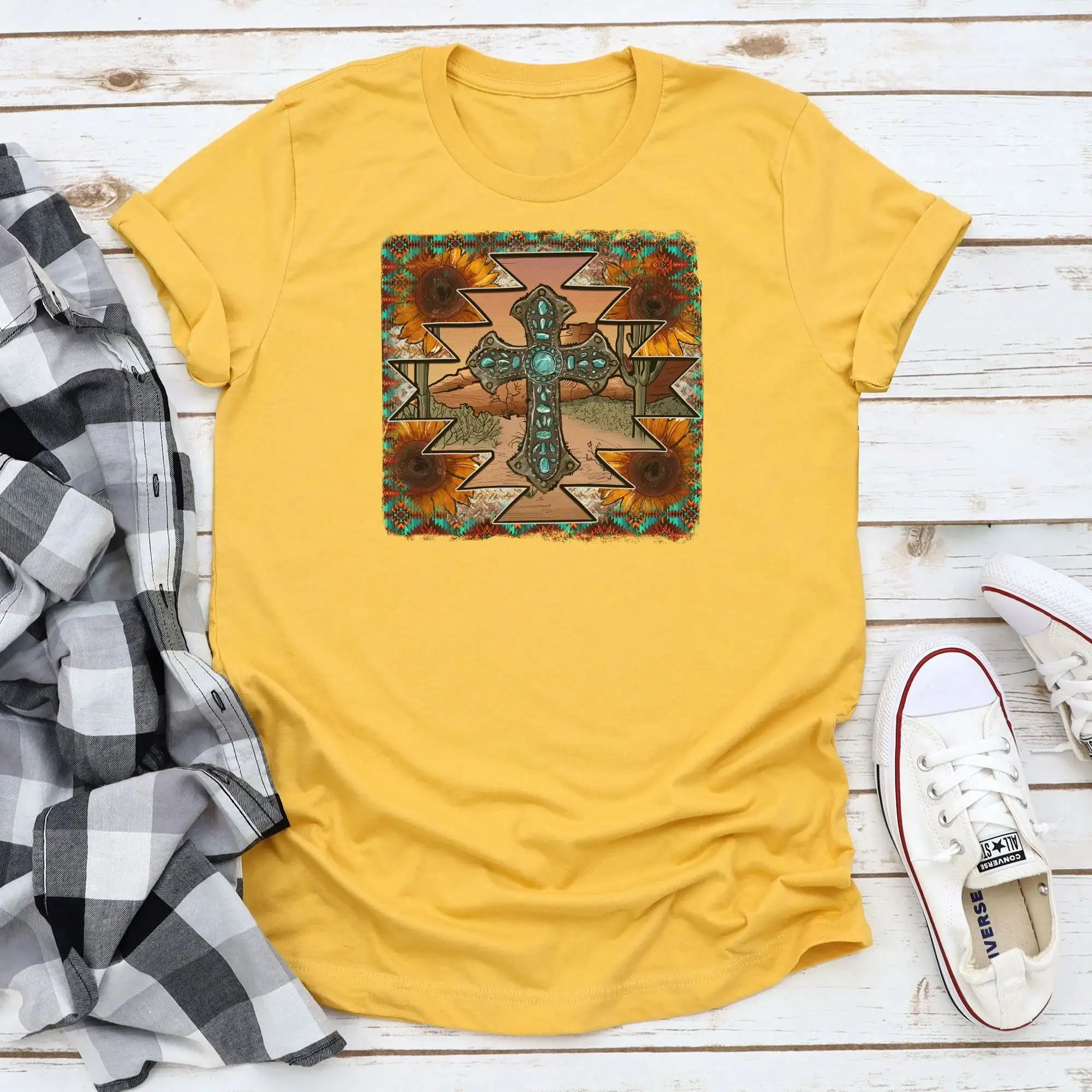 Mustard Short Sleeve Aztec Sunflower Cross T-Shirt.