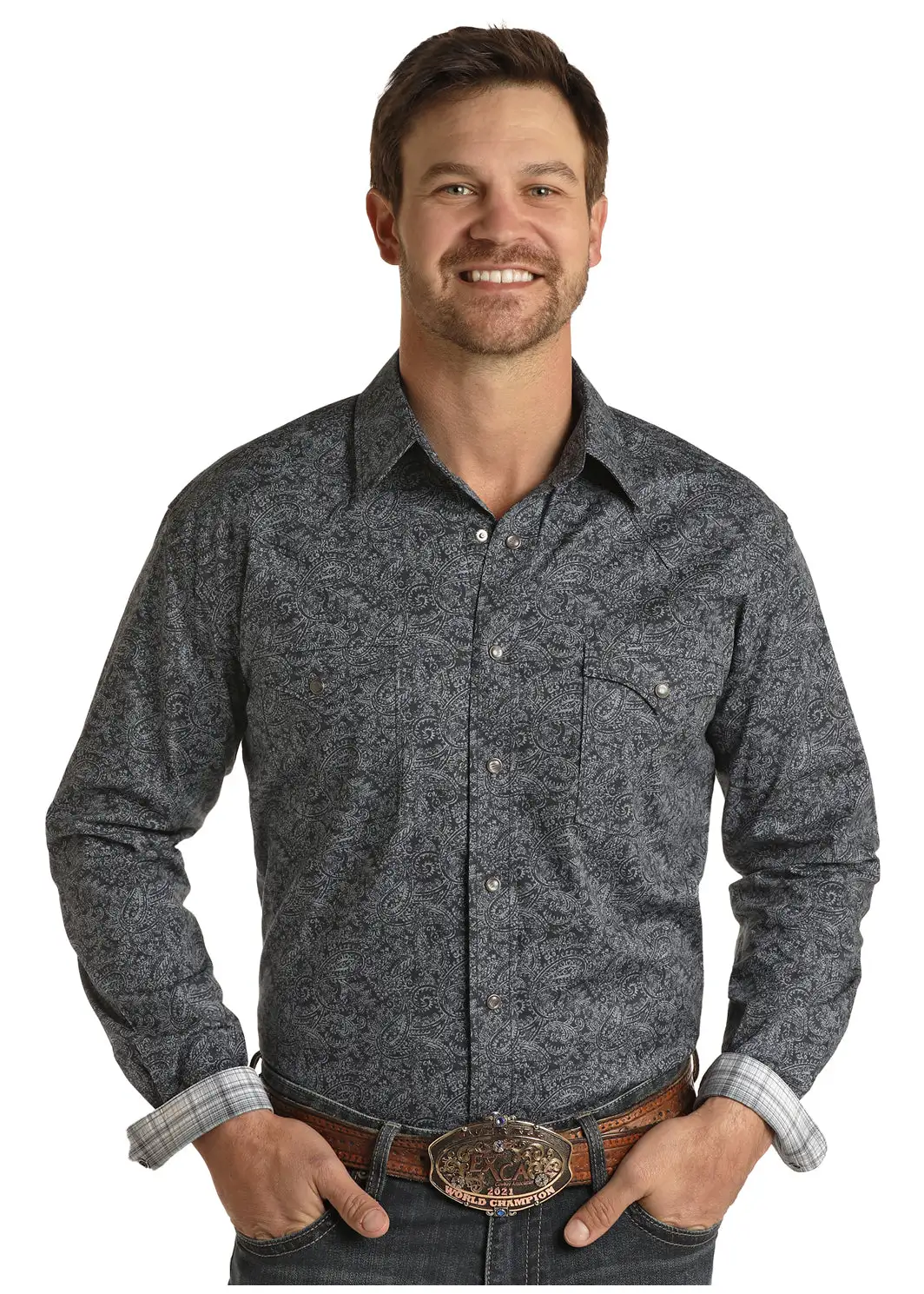 Indigo Paisley Long Sleeve Snap Front Shirt.