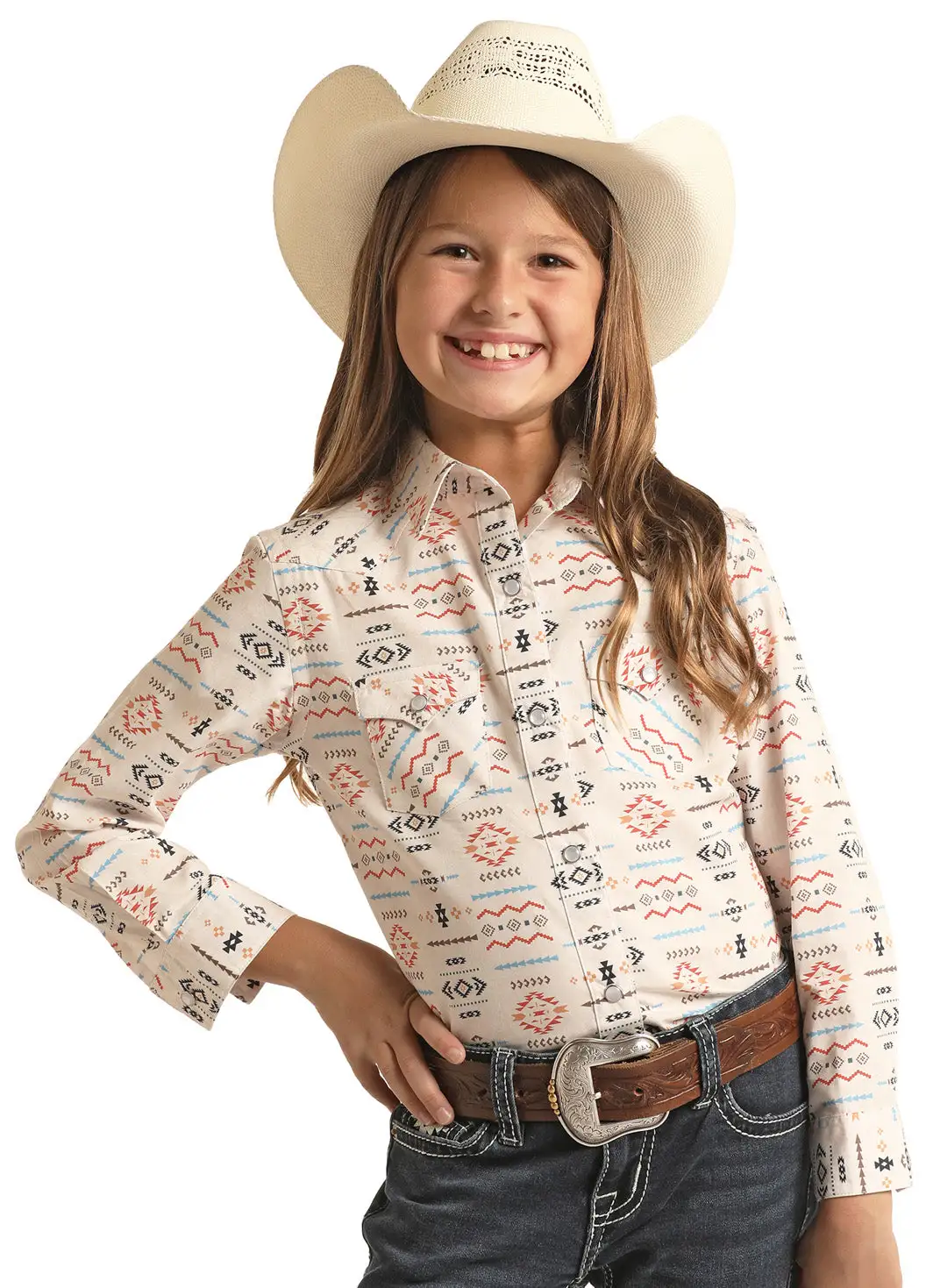 Cream with Multi-Color Aztec Print Long Sleeve Snap Front Shirt.