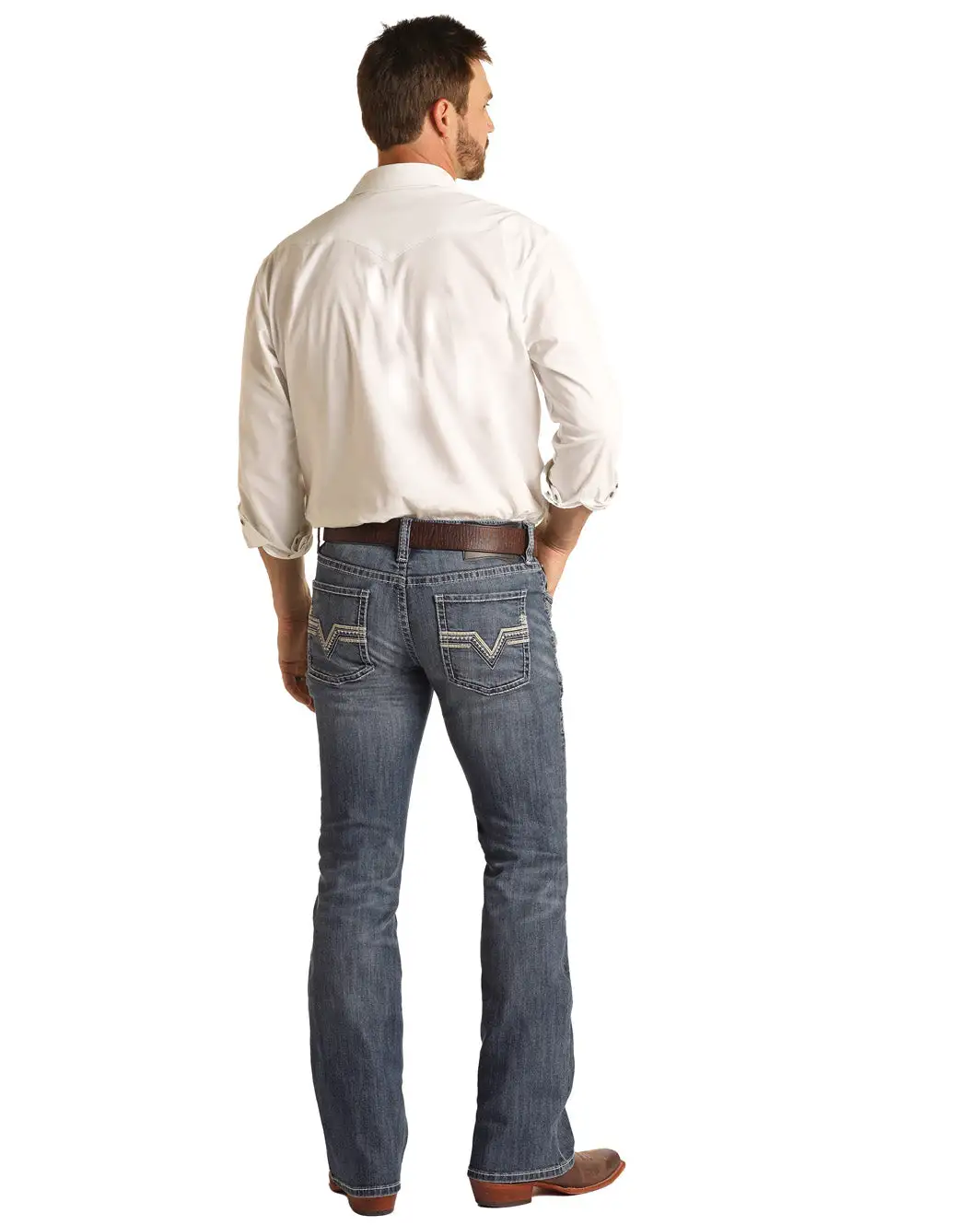 Medium Vintage Wash Pistol Bootcut Jean with Leather and Embroidered “V” Back Pocket.